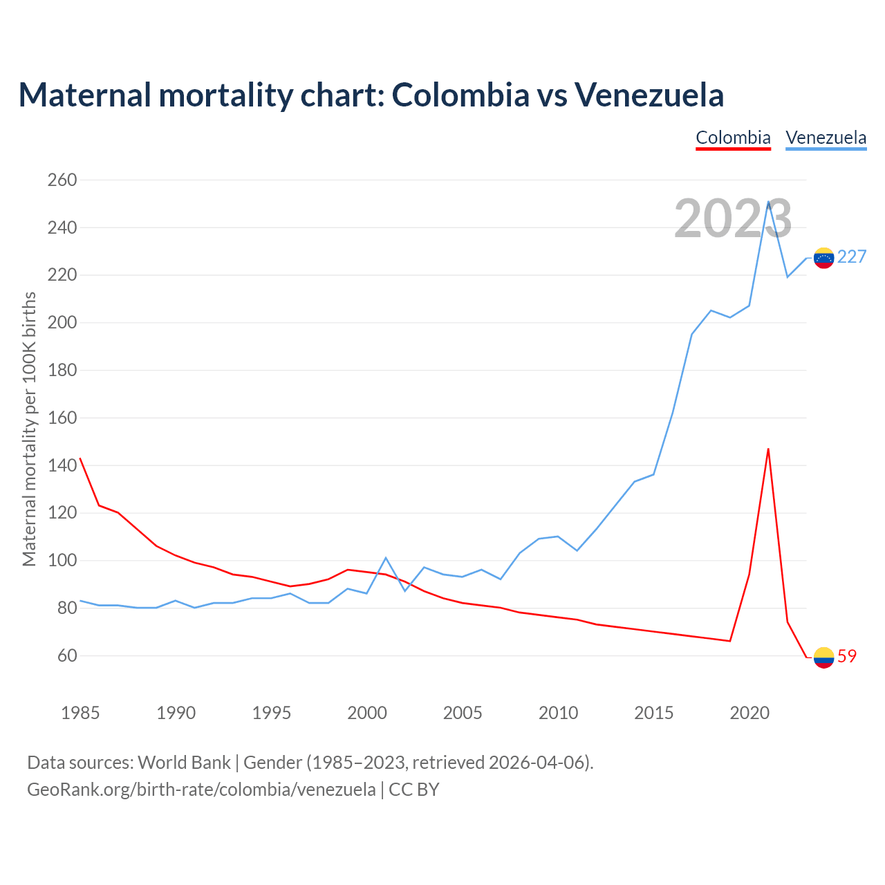 The maternal mortality rate, which is the probability of dying during childbirth or within 42 days of pregnancy termination, is 59 deaths per 100,000 live births in Colombia, compared to 227 deaths in Venezuela.