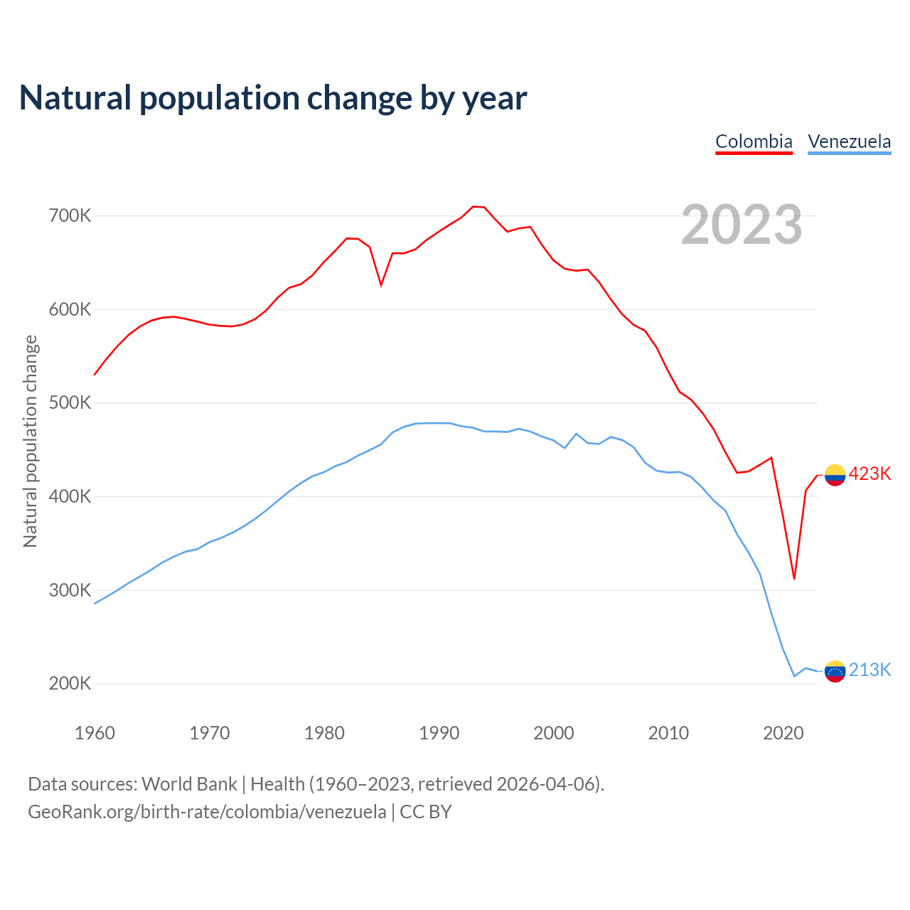 According to the latest available data on birth rates, the fertility rate in Colombia was 1.65 children per woman in 2023, compared to 2.08 in Venezuela in 2023. The replacement level is considered to be 2.1 children per woman.