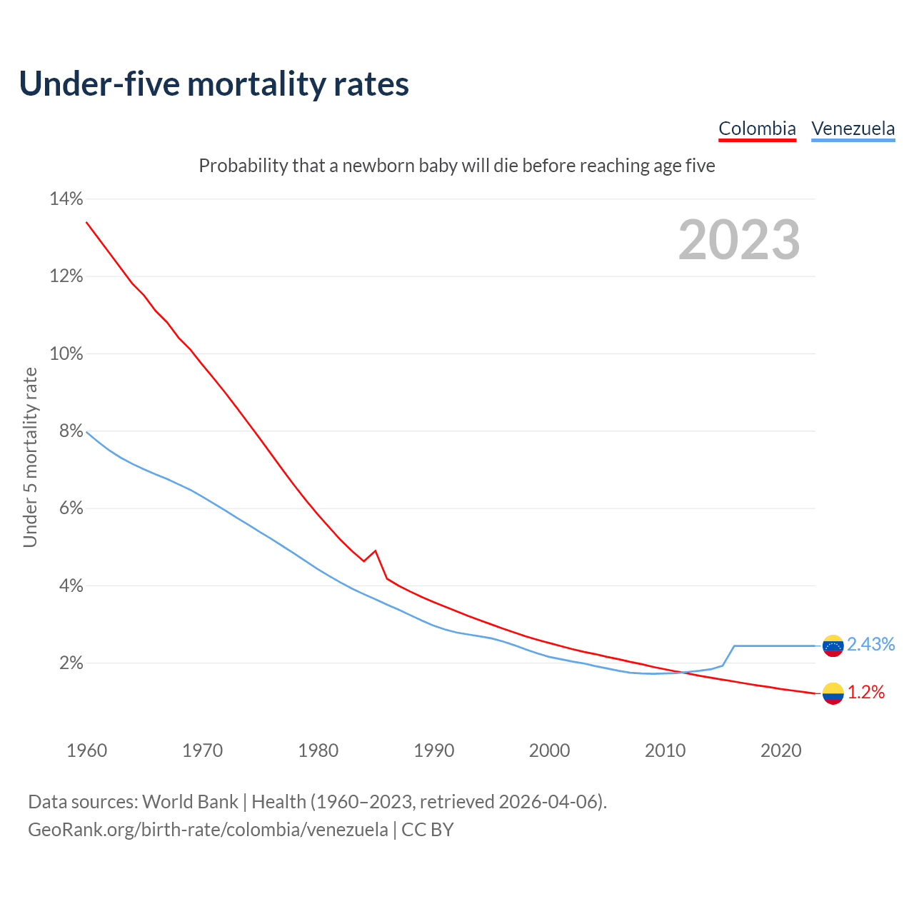 The chance that a newborn baby will die before reaching age five is 1.2% in Colombia and 2.43% in Venezuela. Above is a chart with historical data on under-five mortality rates.
