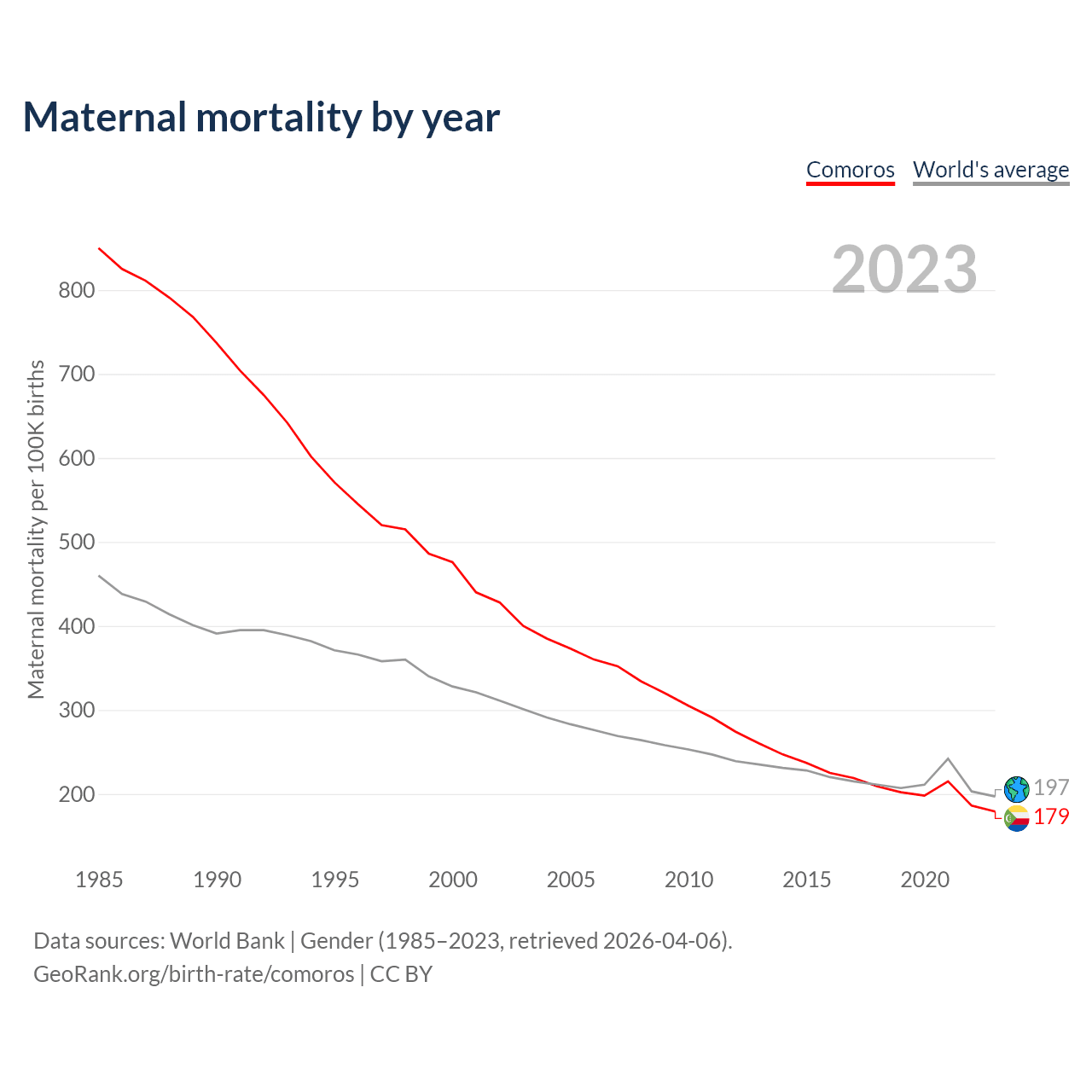 The maternal mortality rate in Comoros was 179 deaths per 100,000 live births in 2023 — a 0.18% chance of dying during childbirth or within 42 days of pregnancy termination. This is a 62.4% decrease compared to the year 2000.