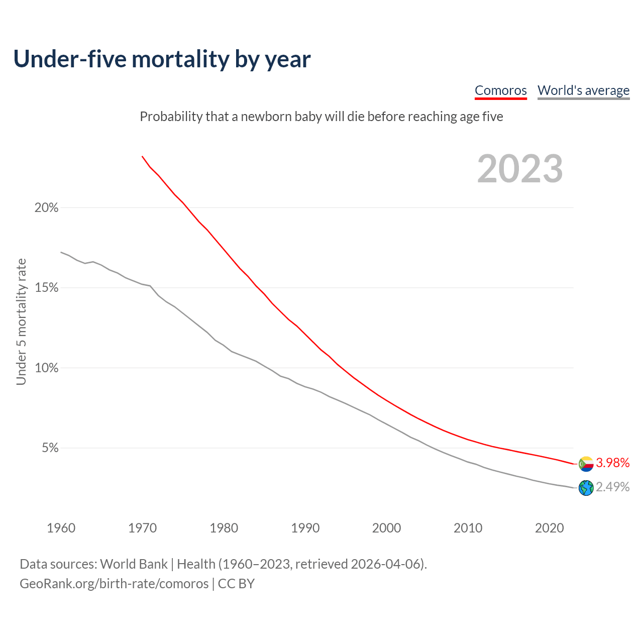The under-5 mortality rate in Comoros was 39.8 deaths per 1,000 live births in 2023 — a 3.98% chance that a newborn baby will die before reaching age five. This is down from 79.6 deaths per 1,000 live births in 2000.