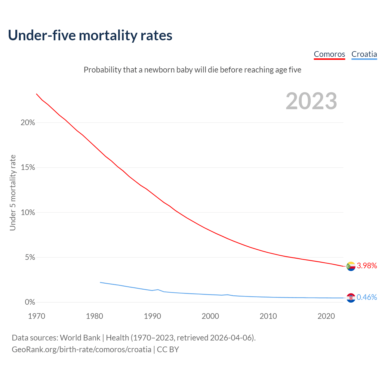 The chance that a newborn baby will die before reaching age five is 3.98% in Comoros and 0.46% in Croatia. Above is a chart with historical data on under-five mortality rates.
