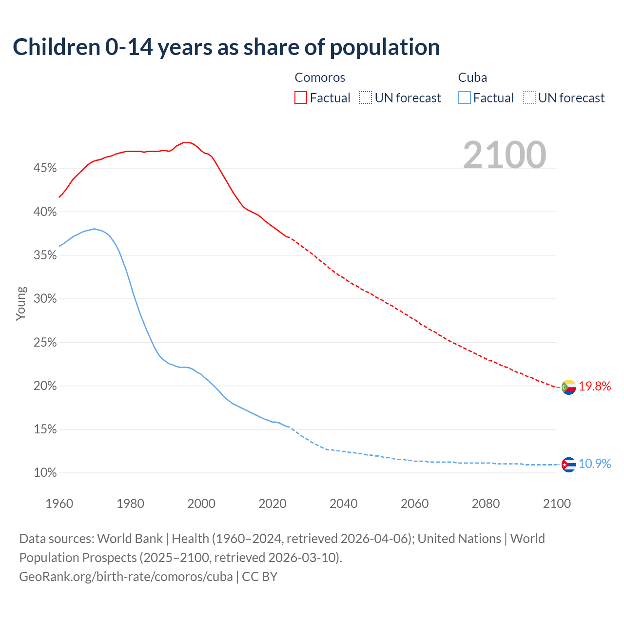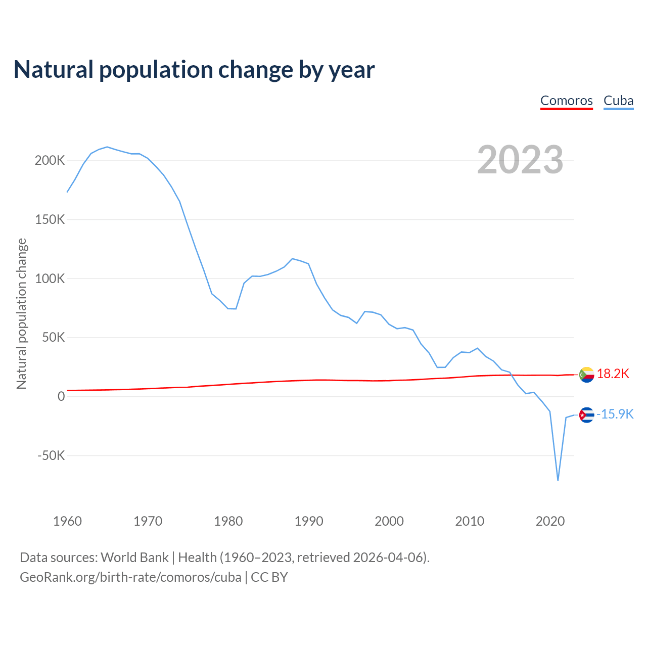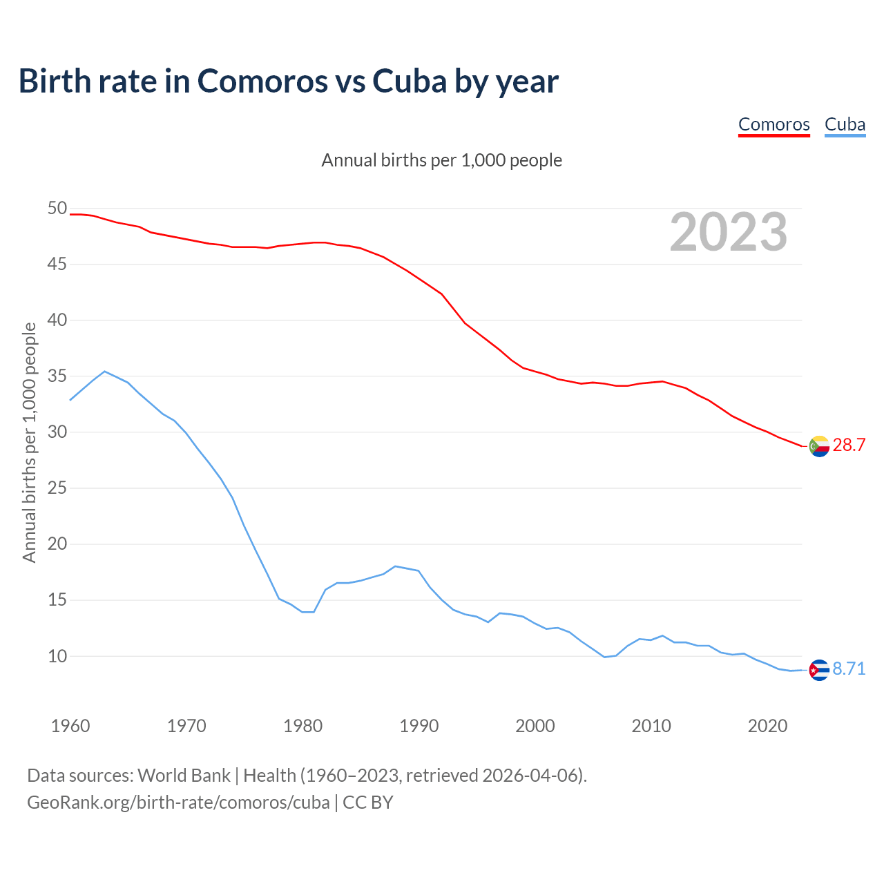Comoros has an annual birth rate of 28.7 births per 1,000 people, compared to 8.71 for Cuba. The average number of children a woman is expected to have during her lifetime — the fertility rate, is 3.88 in Comoros and 1.44 in Cuba — 62.9% difference.