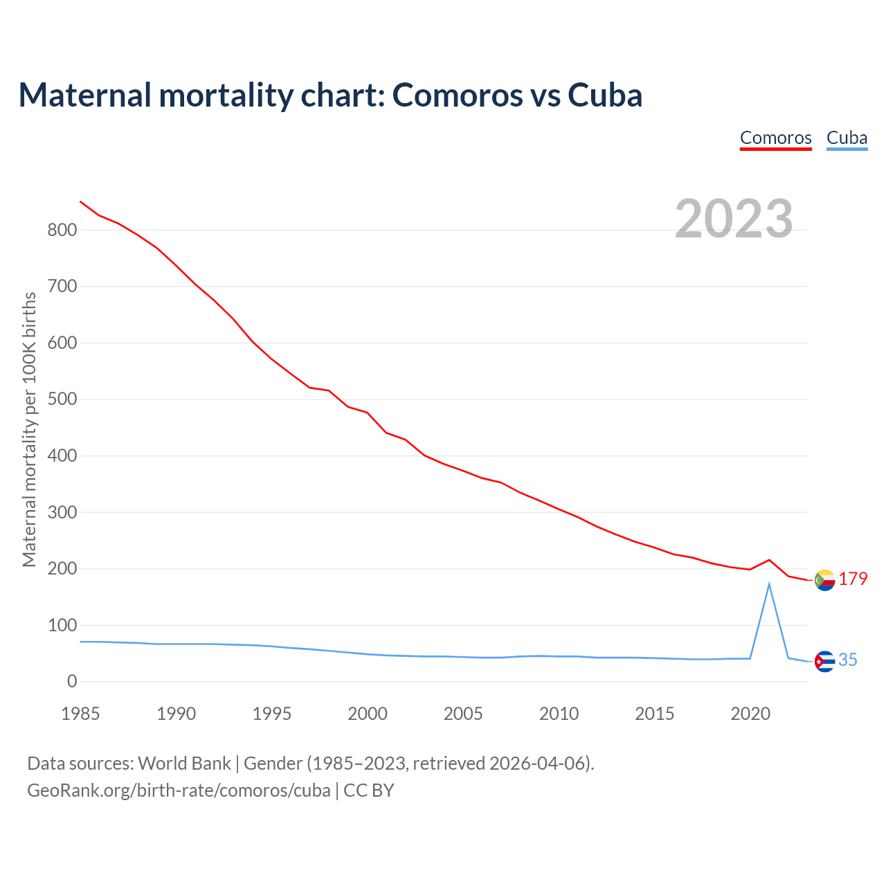 The maternal mortality rate, which is the probability of dying during childbirth or within 42 days of pregnancy termination, is 179 deaths per 100,000 live births in Comoros, compared to 35 deaths in Cuba.