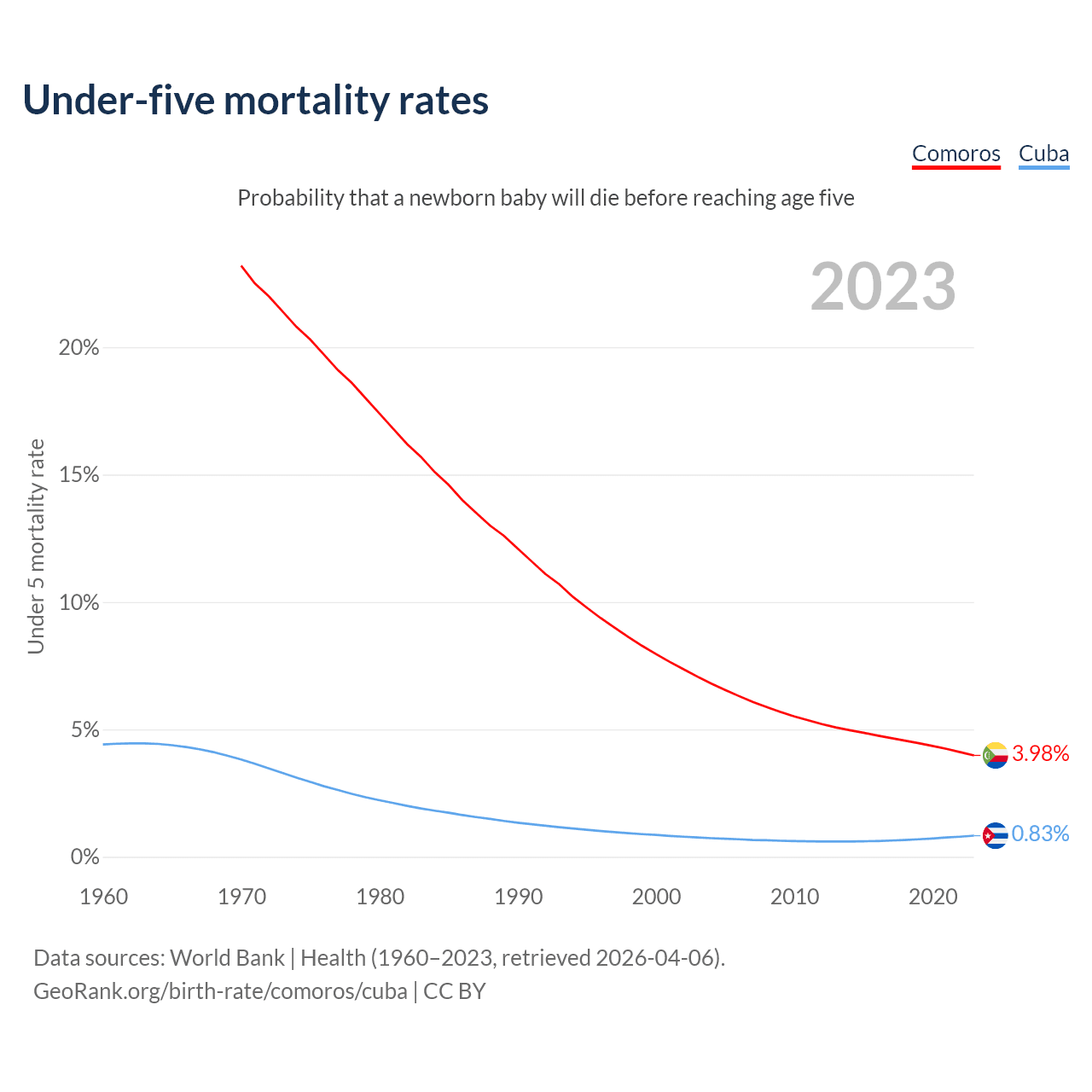The chance that a newborn baby will die before reaching age five is 3.98% in Comoros and 0.83% in Cuba. Above is a chart with historical data on under-five mortality rates.