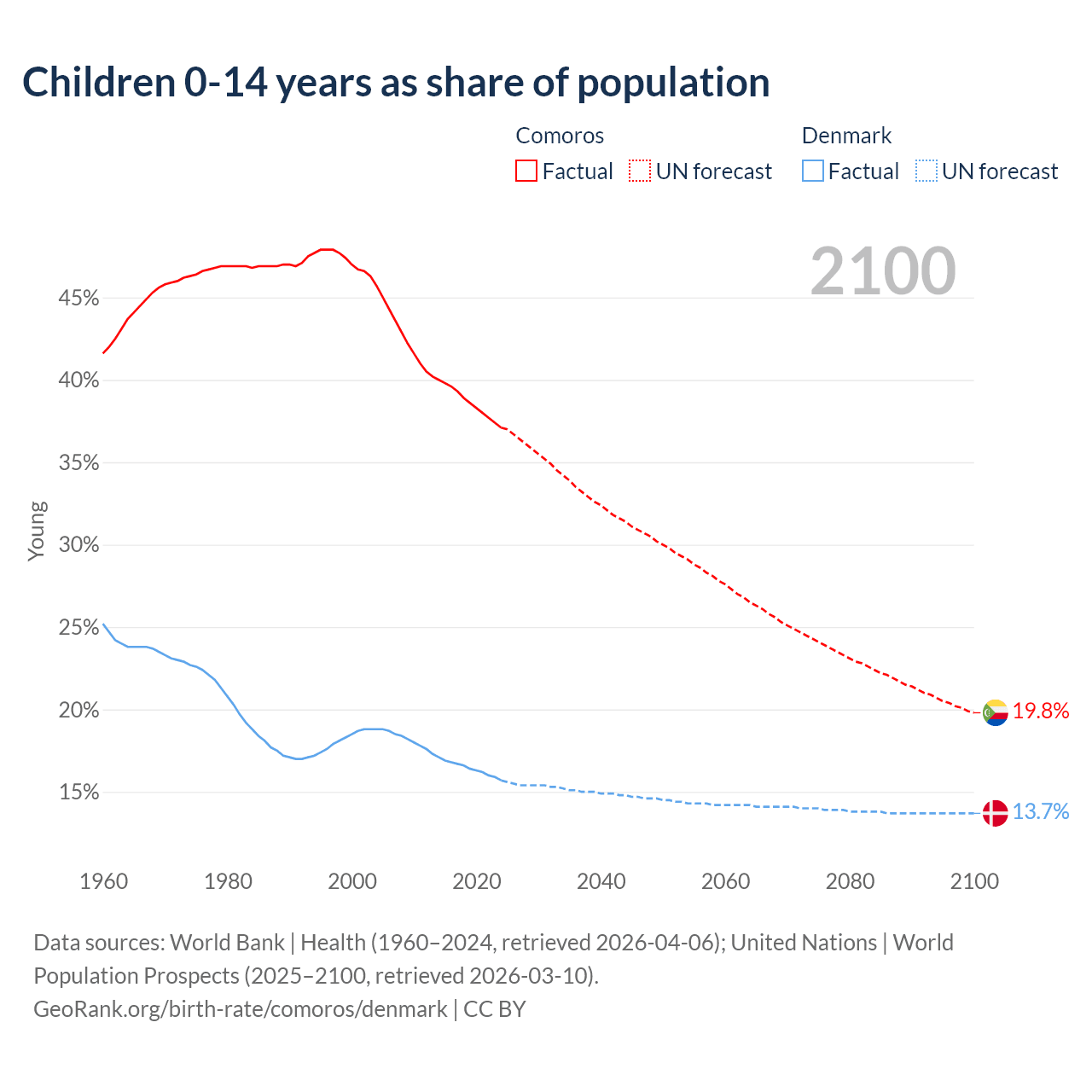 Comoros has an annual birth rate of 28.7 births per 1,000 people, compared to 9.7 for Denmark. The average number of children a woman is expected to have during her lifetime — the fertility rate, is 3.88 in Comoros and 1.5 in Denmark — 61.3% difference.