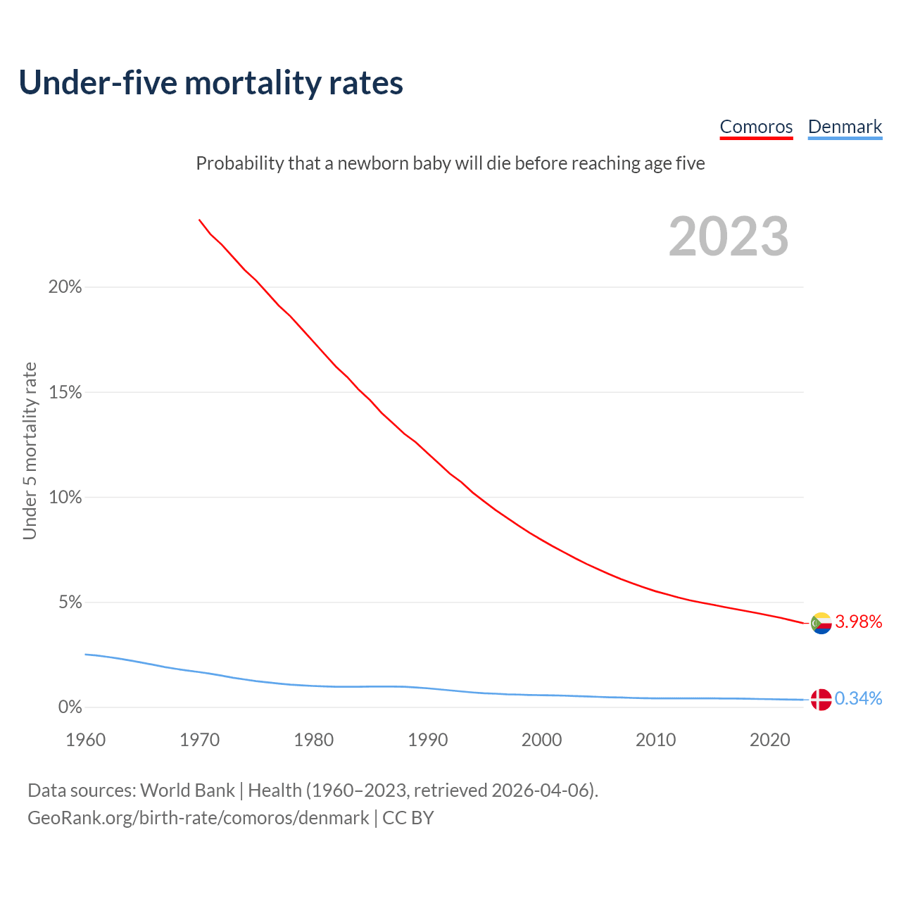 The chance that a newborn baby will die before reaching age five is 3.98% in Comoros and 0.34% in Denmark. Above is a chart with historical data on under-five mortality rates.