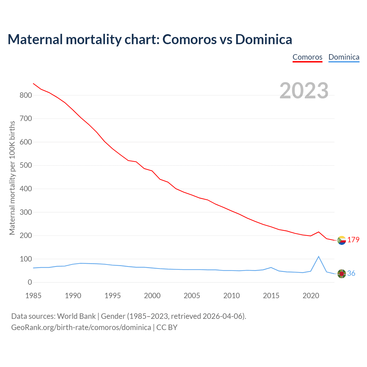The maternal mortality rate, which is the probability of dying during childbirth or within 42 days of pregnancy termination, is 179 deaths per 100,000 live births in Comoros, compared to 36 deaths in Dominica.