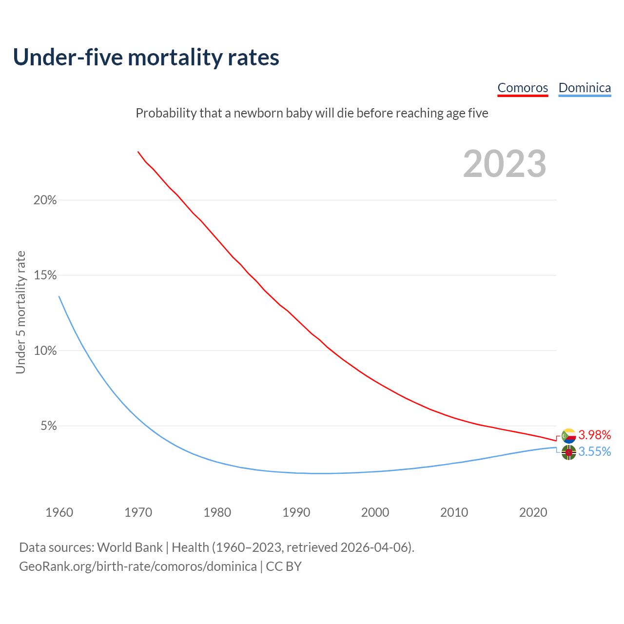 The chance that a newborn baby will die before reaching age five is 3.98% in Comoros and 3.55% in Dominica. Above is a chart with historical data on under-five mortality rates.