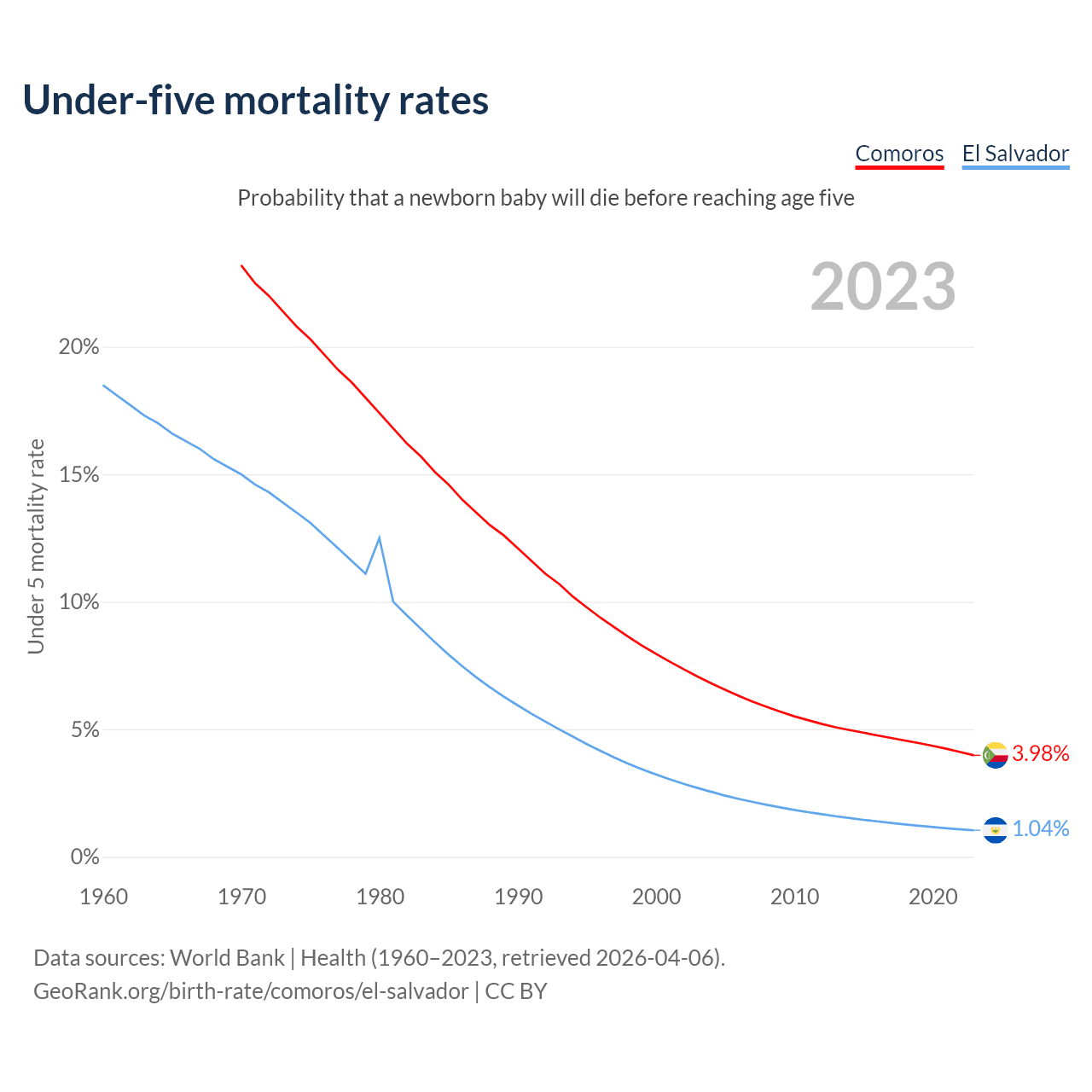The chance that a newborn baby will die before reaching age five is 3.98% in Comoros and 1.04% in El Salvador. Above is a chart with historical data on under-five mortality rates.