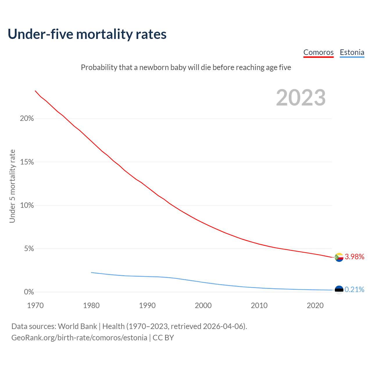 The chance that a newborn baby will die before reaching age five is 3.98% in Comoros and 0.21% in Estonia. Above is a chart with historical data on under-five mortality rates.