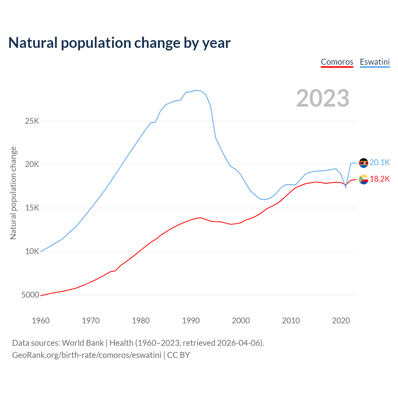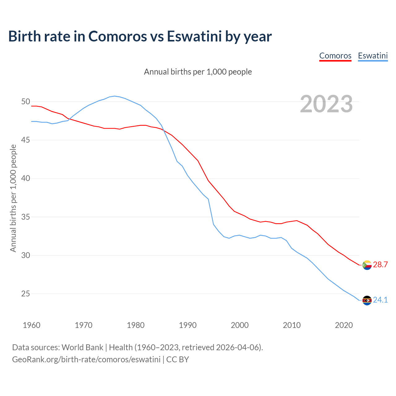 Comoros has an annual birth rate of 28.7 births per 1,000 people, compared to 24.1 for Eswatini. The average number of children a woman is expected to have during her lifetime — the fertility rate, is 3.88 in Comoros and 2.75 in Eswatini — 29% difference.