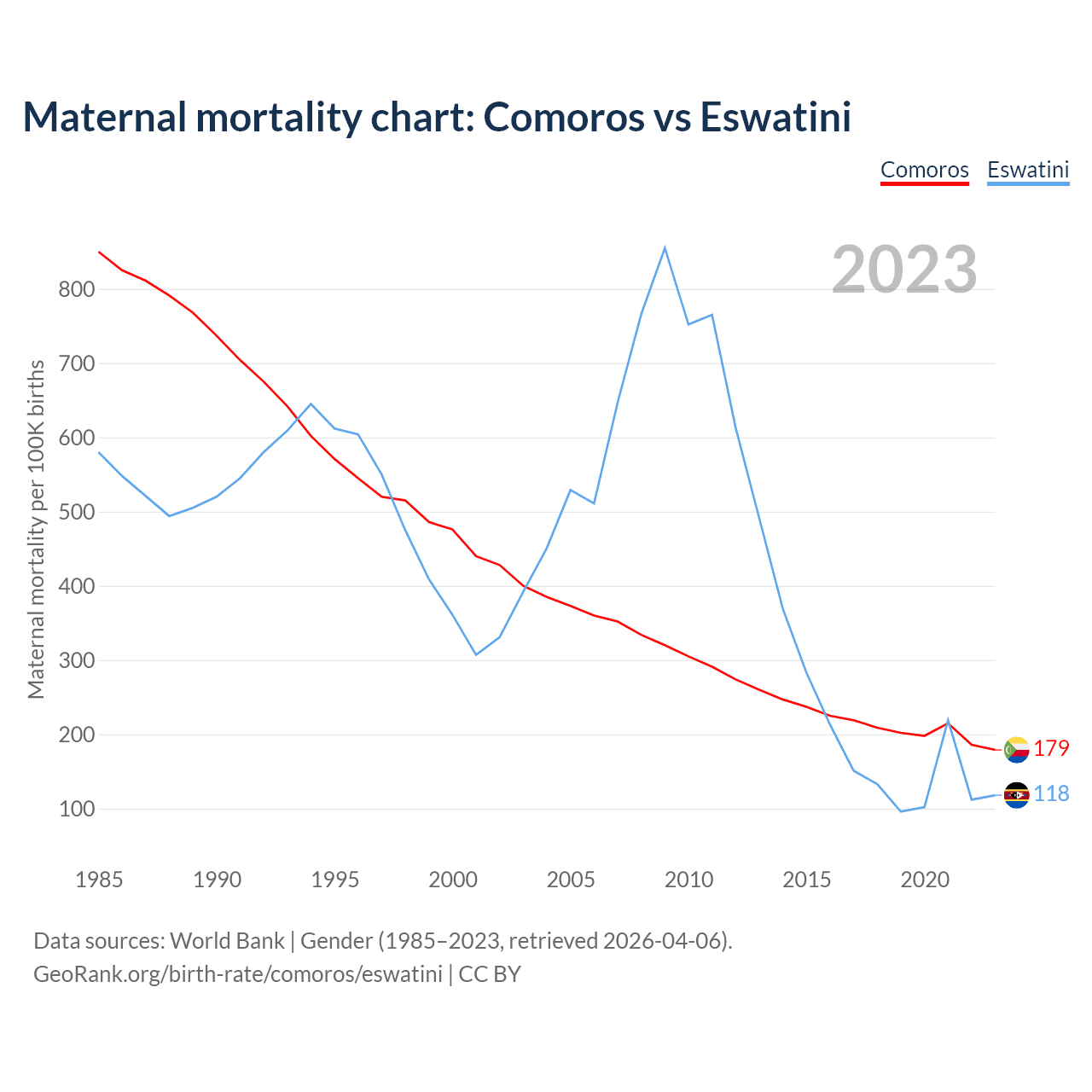The maternal mortality rate, which is the probability of dying during childbirth or within 42 days of pregnancy termination, is 179 deaths per 100,000 live births in Comoros, compared to 118 deaths in Eswatini.