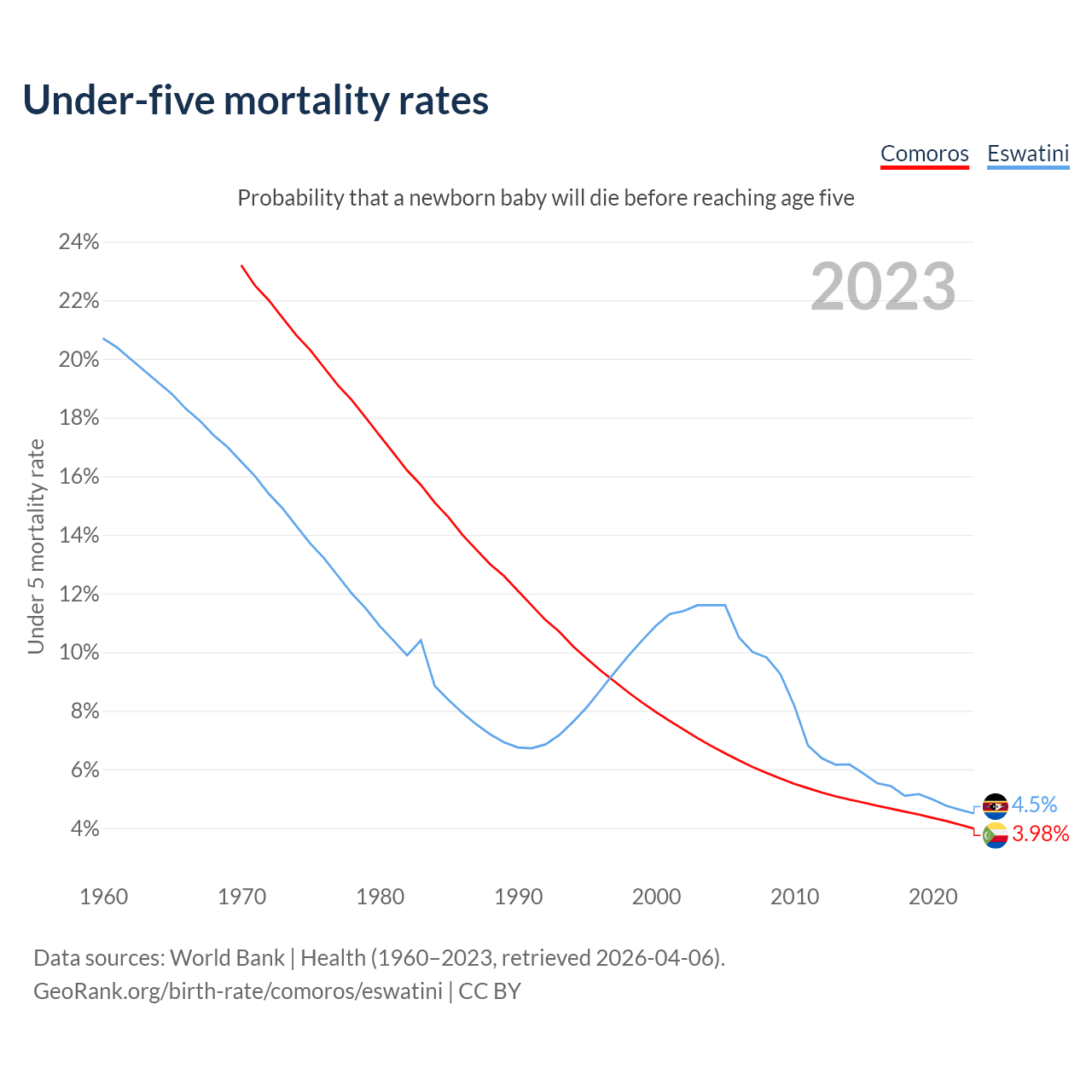 The chance that a newborn baby will die before reaching age five is 3.98% in Comoros and 4.5% in Eswatini. Above is a chart with historical data on under-five mortality rates.