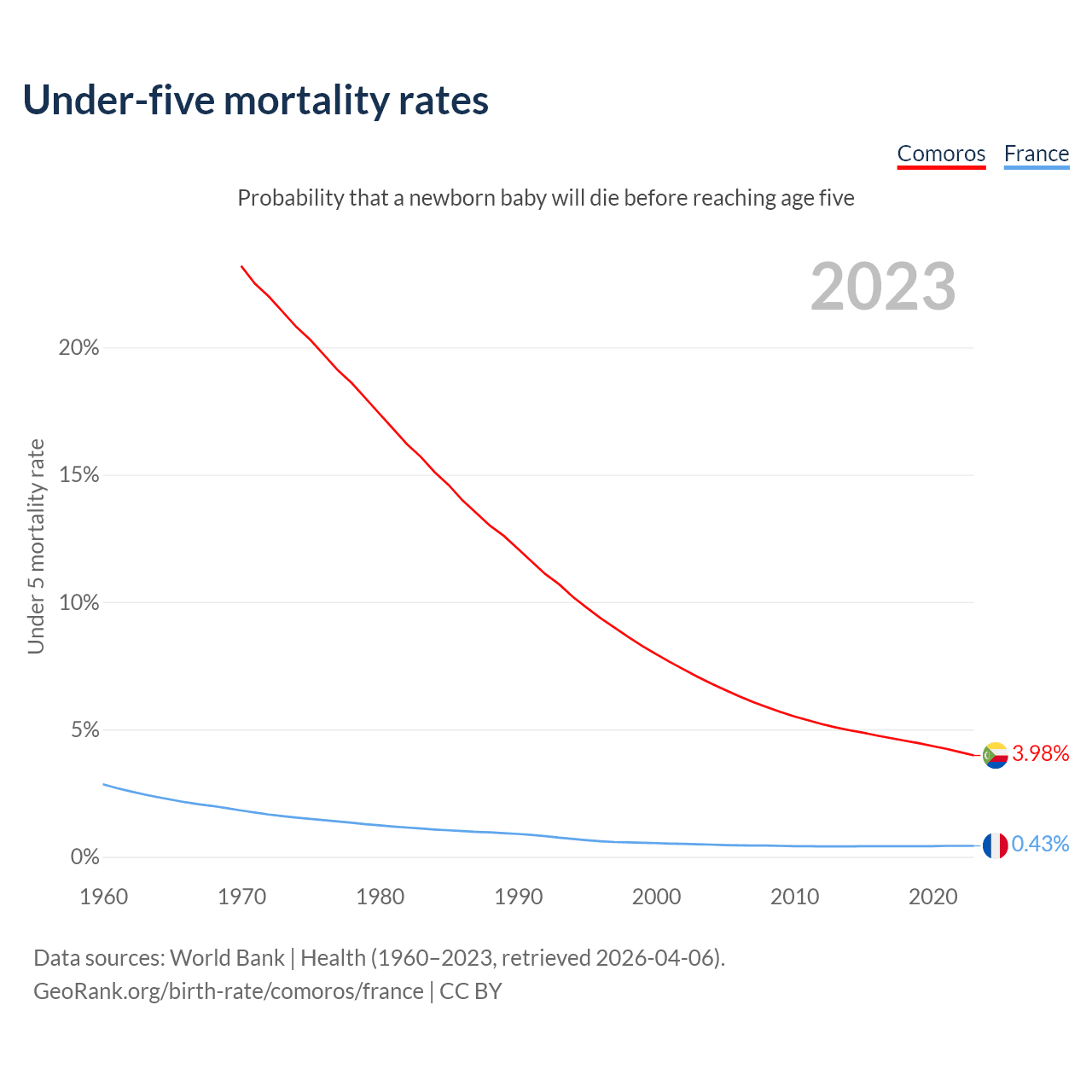 The chance that a newborn baby will die before reaching age five is 3.98% in Comoros and 0.43% in France. Above is a chart with historical data on under-five mortality rates.