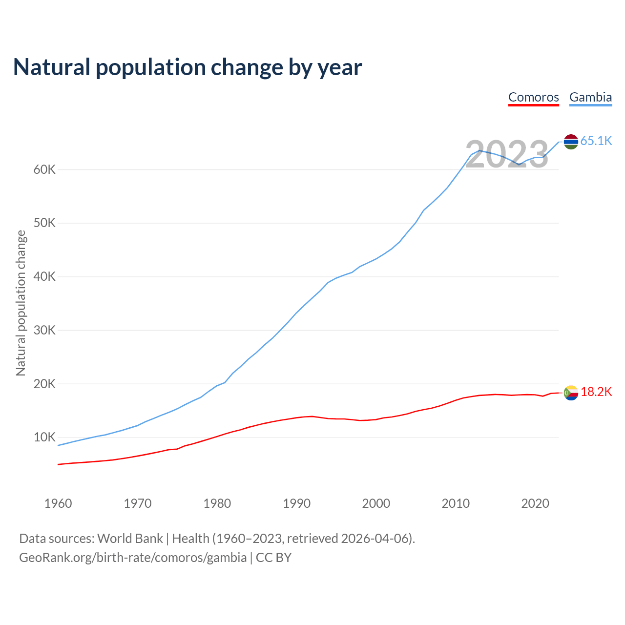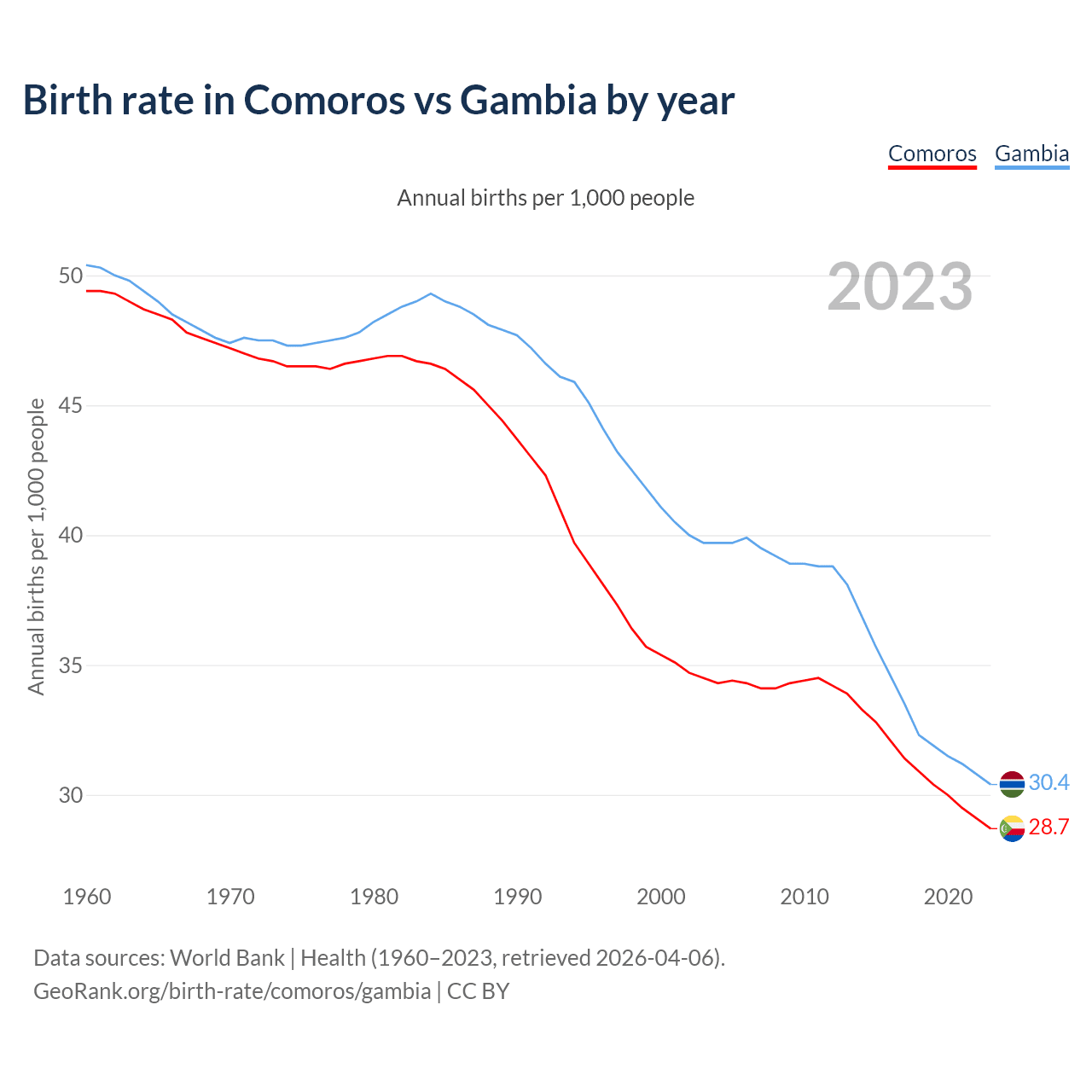 Comoros has an annual birth rate of 28.7 births per 1,000 people, compared to 30.4 for the Gambia. The average number of children a woman is expected to have during her lifetime — the fertility rate, is 3.88 in Comoros and 4.01 in the Gambia — 3.3% difference.