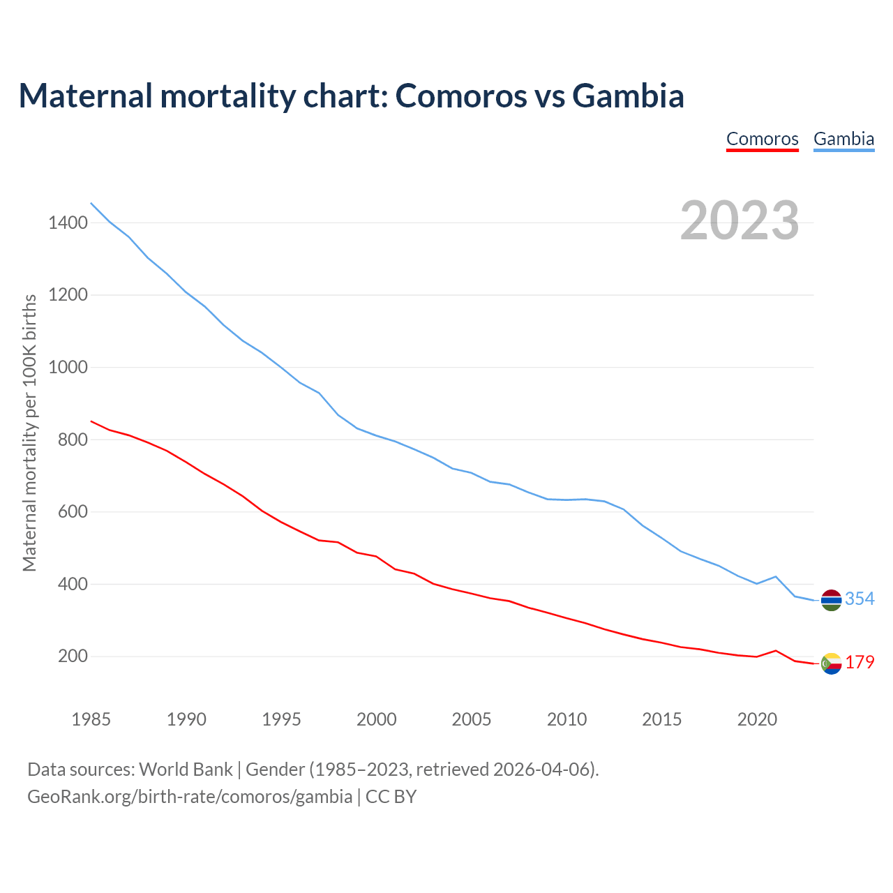 The maternal mortality rate, which is the probability of dying during childbirth or within 42 days of pregnancy termination, is 179 deaths per 100,000 live births in Comoros, compared to 354 deaths in the Gambia.