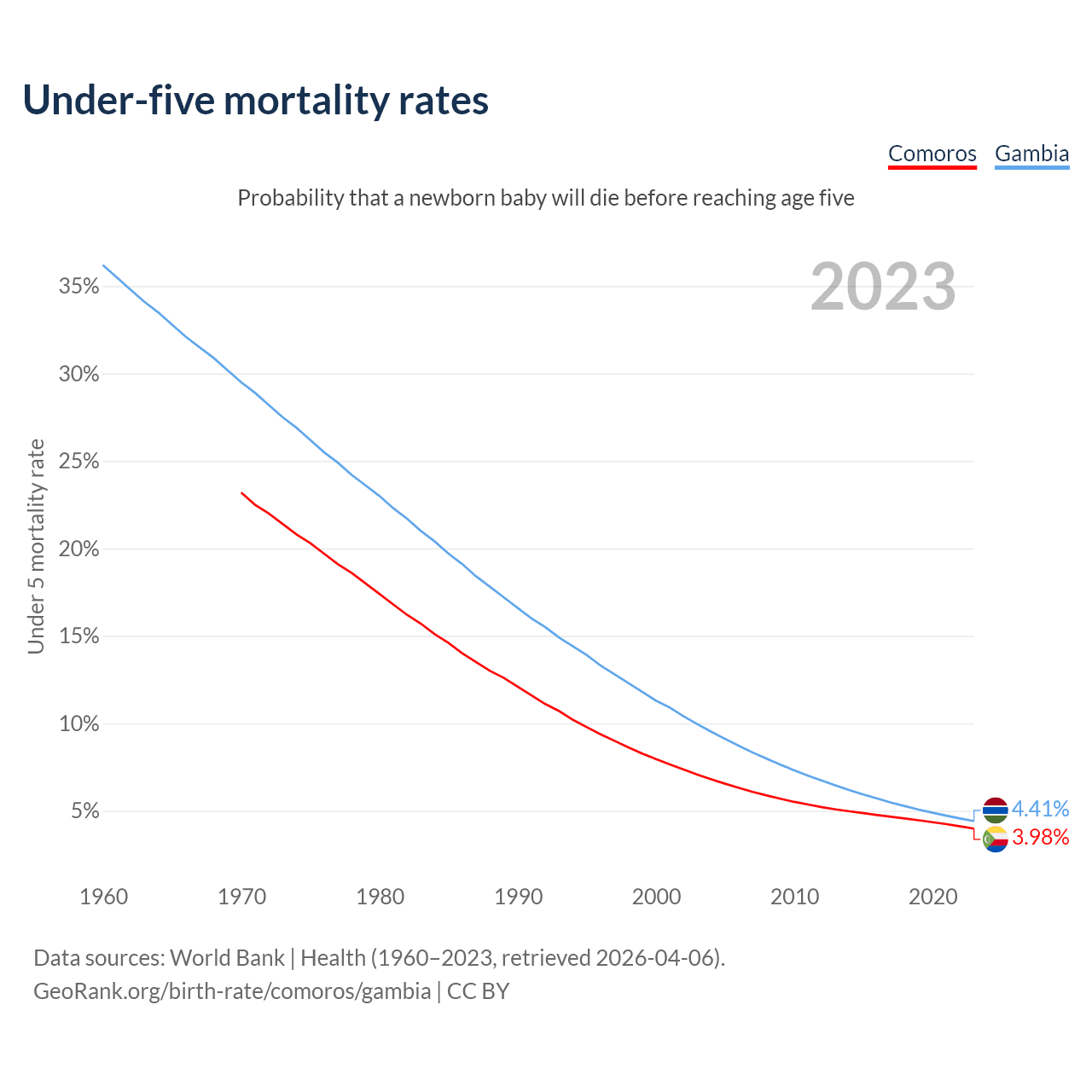 The chance that a newborn baby will die before reaching age five is 3.98% in Comoros and 4.41% in the Gambia. Above is a chart with historical data on under-five mortality rates.