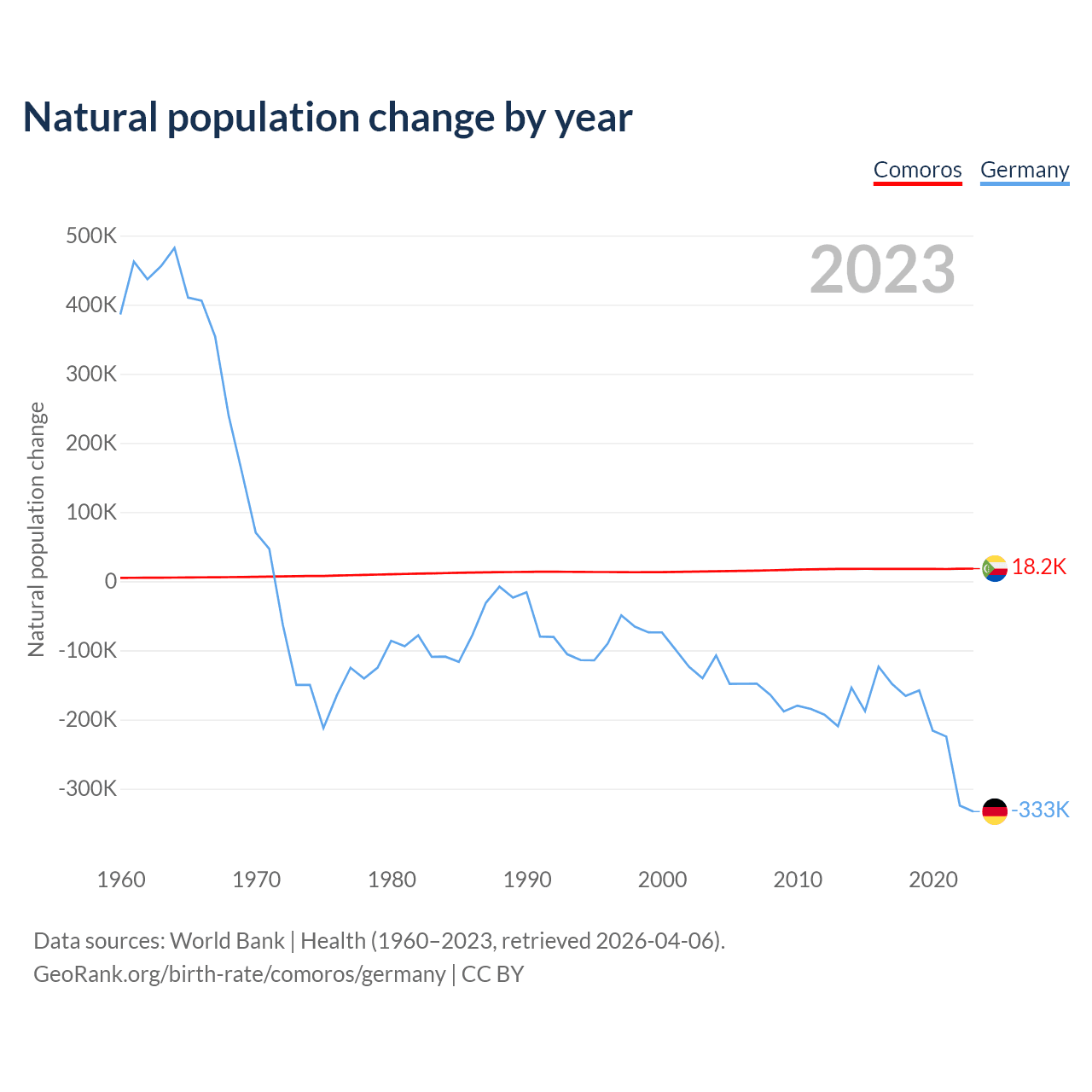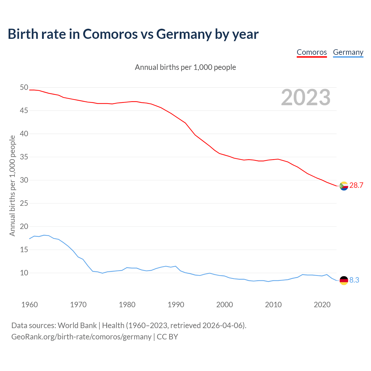 Comoros has an annual birth rate of 28.7 births per 1,000 people, compared to 8.3 for Germany. The average number of children a woman is expected to have during her lifetime — the fertility rate, is 3.88 in Comoros and 1.39 in Germany — 64.2% difference.