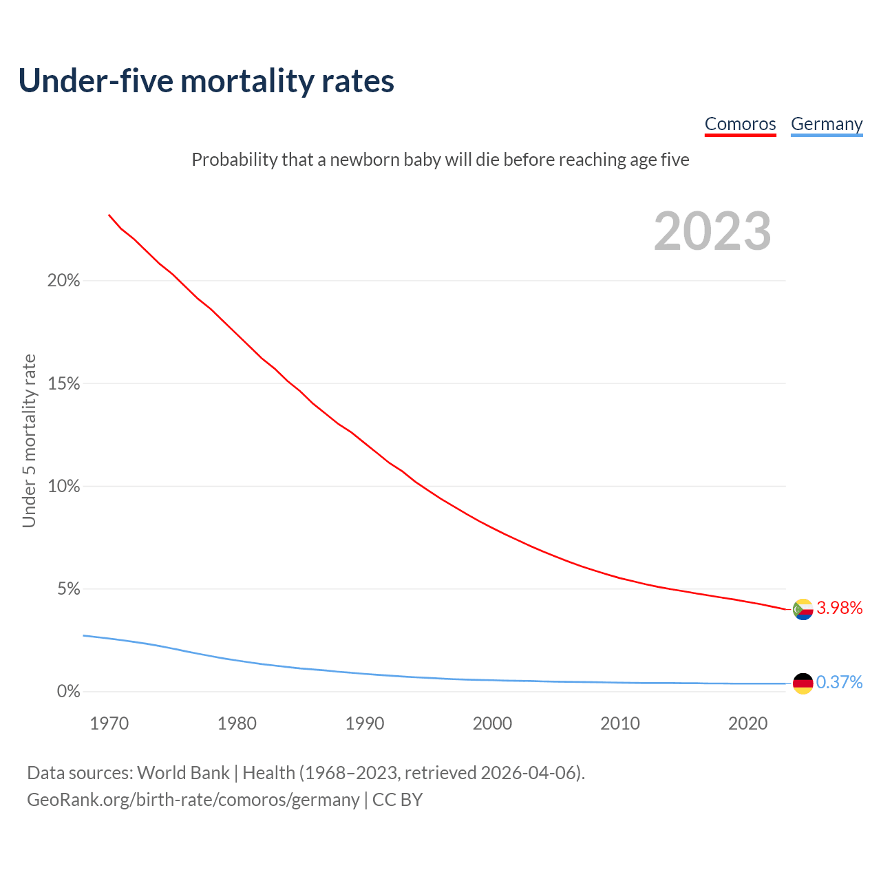 The chance that a newborn baby will die before reaching age five is 3.98% in Comoros and 0.37% in Germany. Above is a chart with historical data on under-five mortality rates.