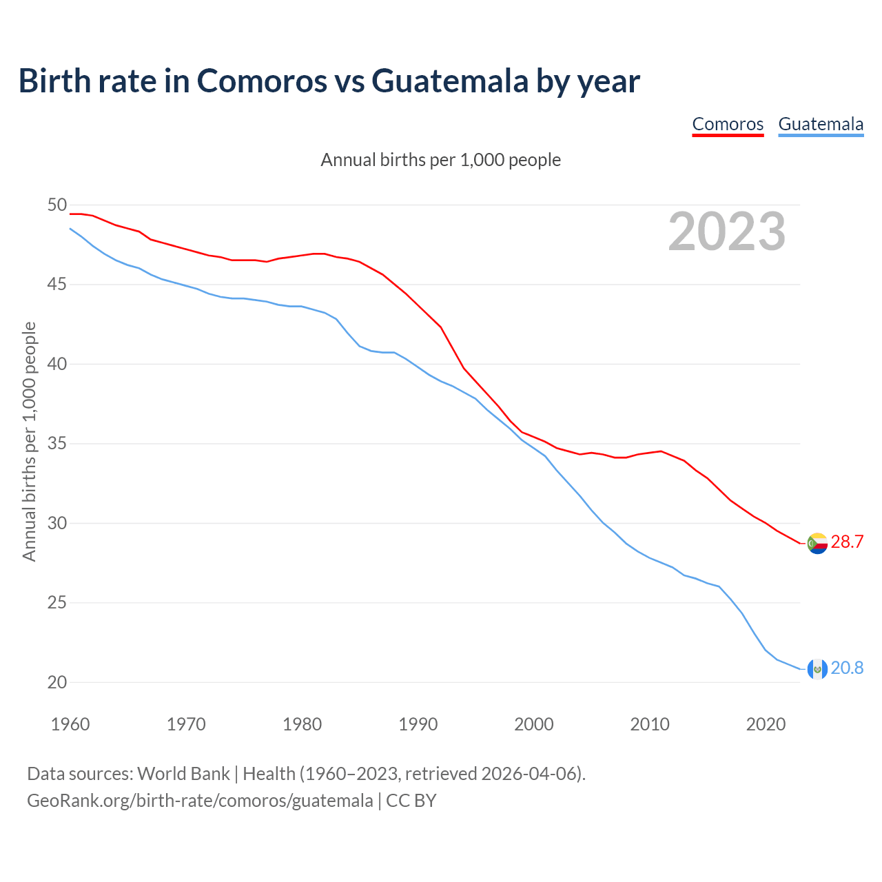 Comoros has an annual birth rate of 28.7 births per 1,000 people, compared to 20.8 for Guatemala. The average number of children a woman is expected to have during her lifetime — the fertility rate, is 3.88 in Comoros and 2.31 in Guatemala — 40.4% difference.