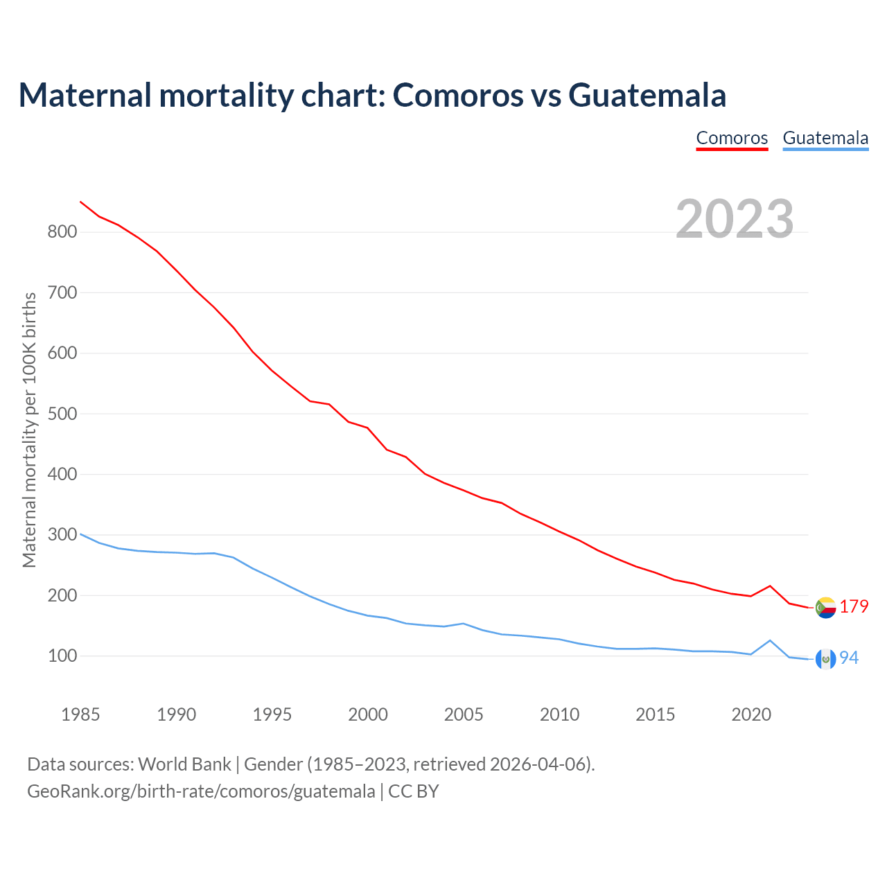 The maternal mortality rate, which is the probability of dying during childbirth or within 42 days of pregnancy termination, is 179 deaths per 100,000 live births in Comoros, compared to 94 deaths in Guatemala.