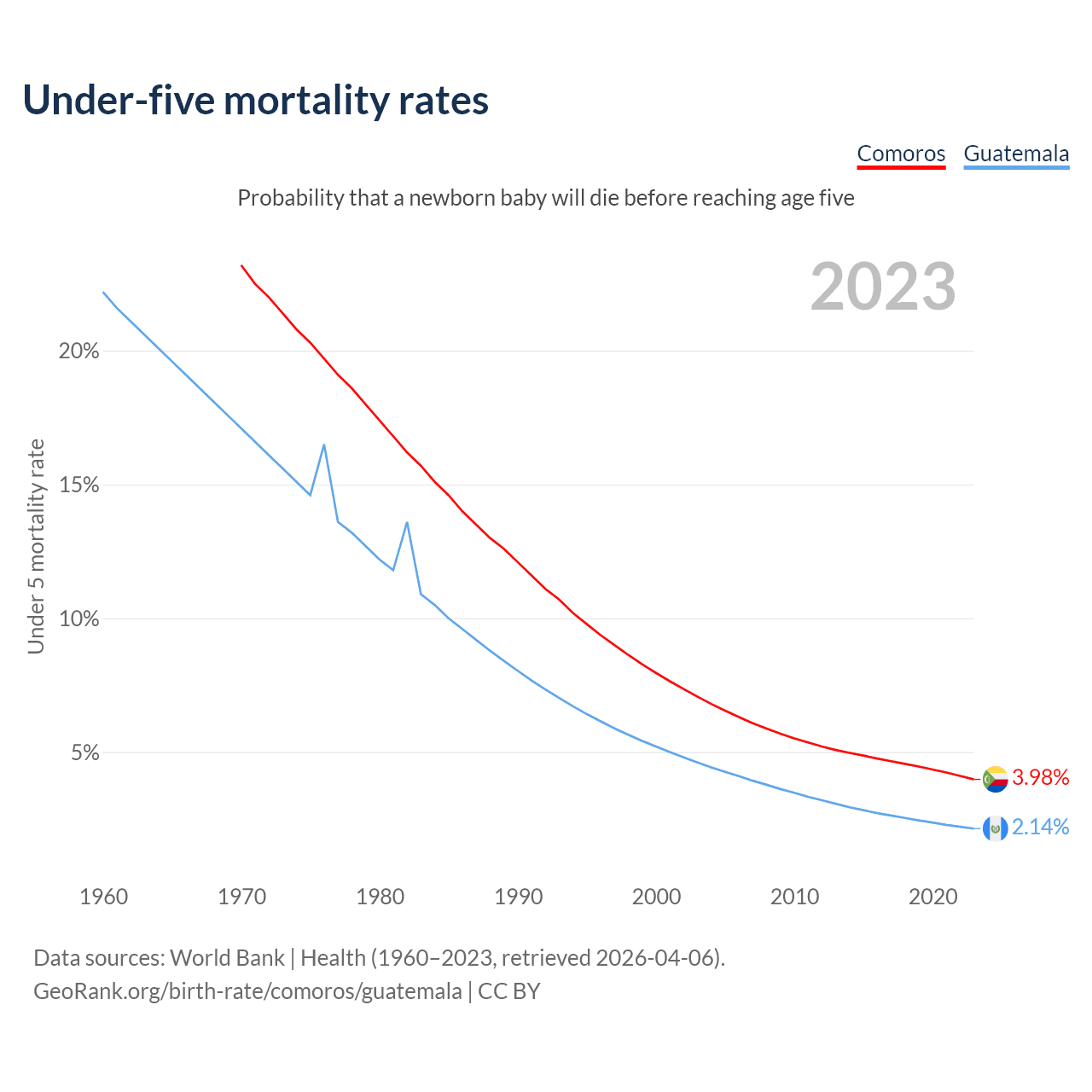 The chance that a newborn baby will die before reaching age five is 3.98% in Comoros and 2.14% in Guatemala. Above is a chart with historical data on under-five mortality rates.