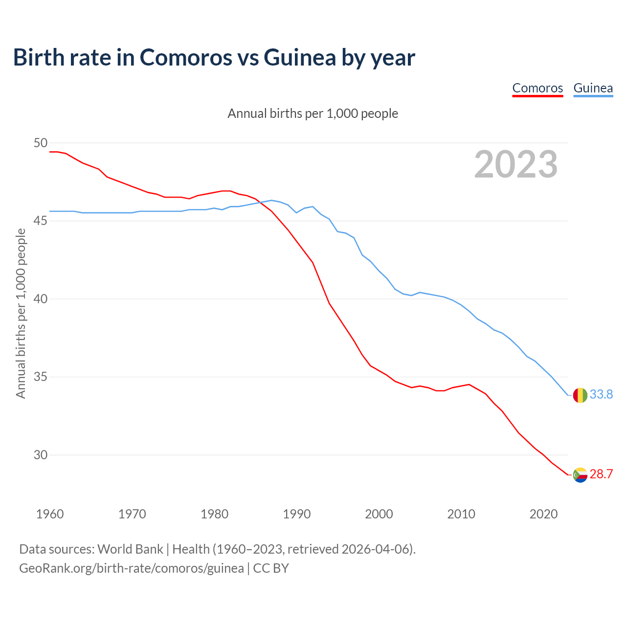 Comoros has an annual birth rate of 28.7 births per 1,000 people, compared to 33.8 for Guinea. The average number of children a woman is expected to have during her lifetime — the fertility rate, is 3.88 in Comoros and 4.22 in Guinea — 8.74% difference.