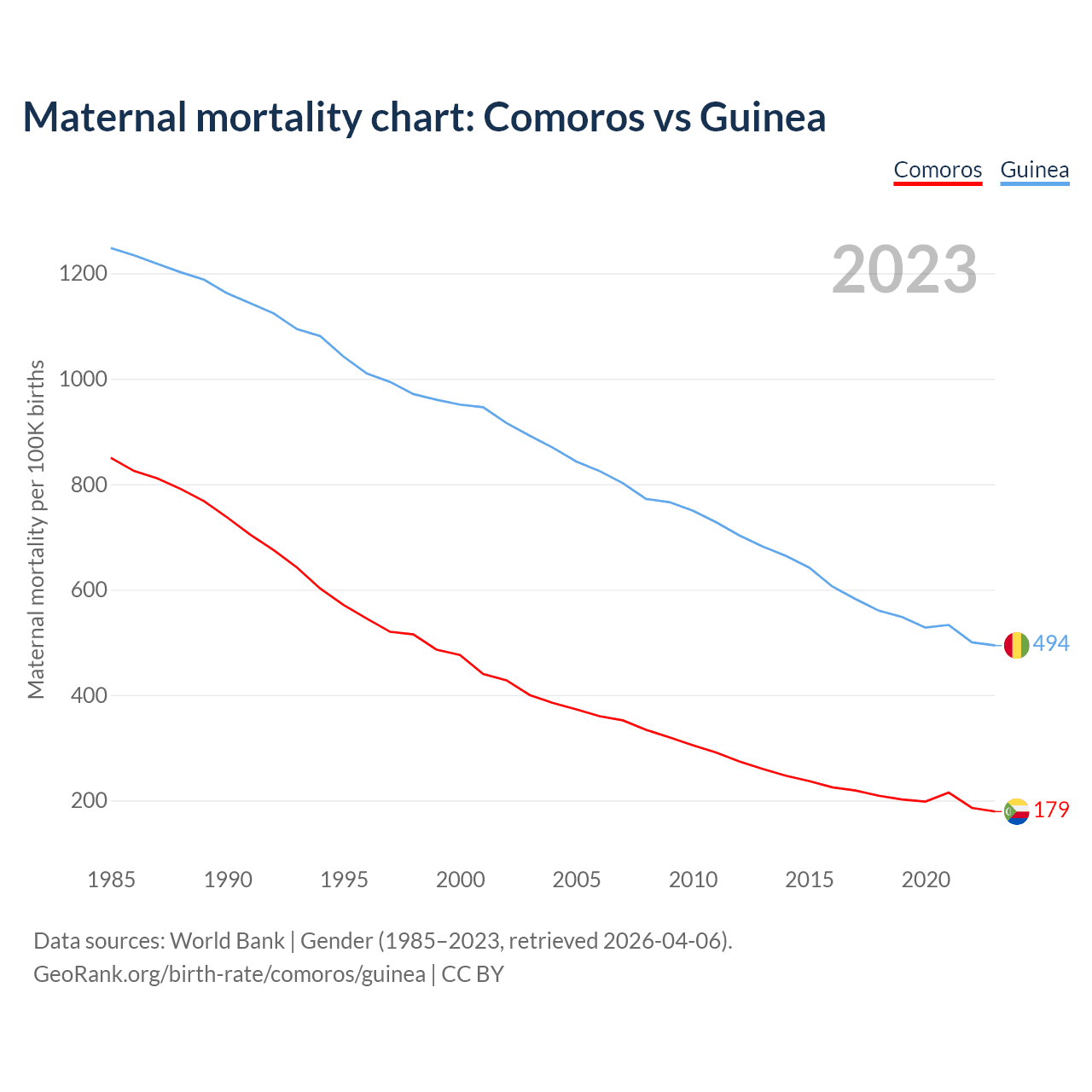 The maternal mortality rate, which is the probability of dying during childbirth or within 42 days of pregnancy termination, is 179 deaths per 100,000 live births in Comoros, compared to 494 deaths in Guinea.