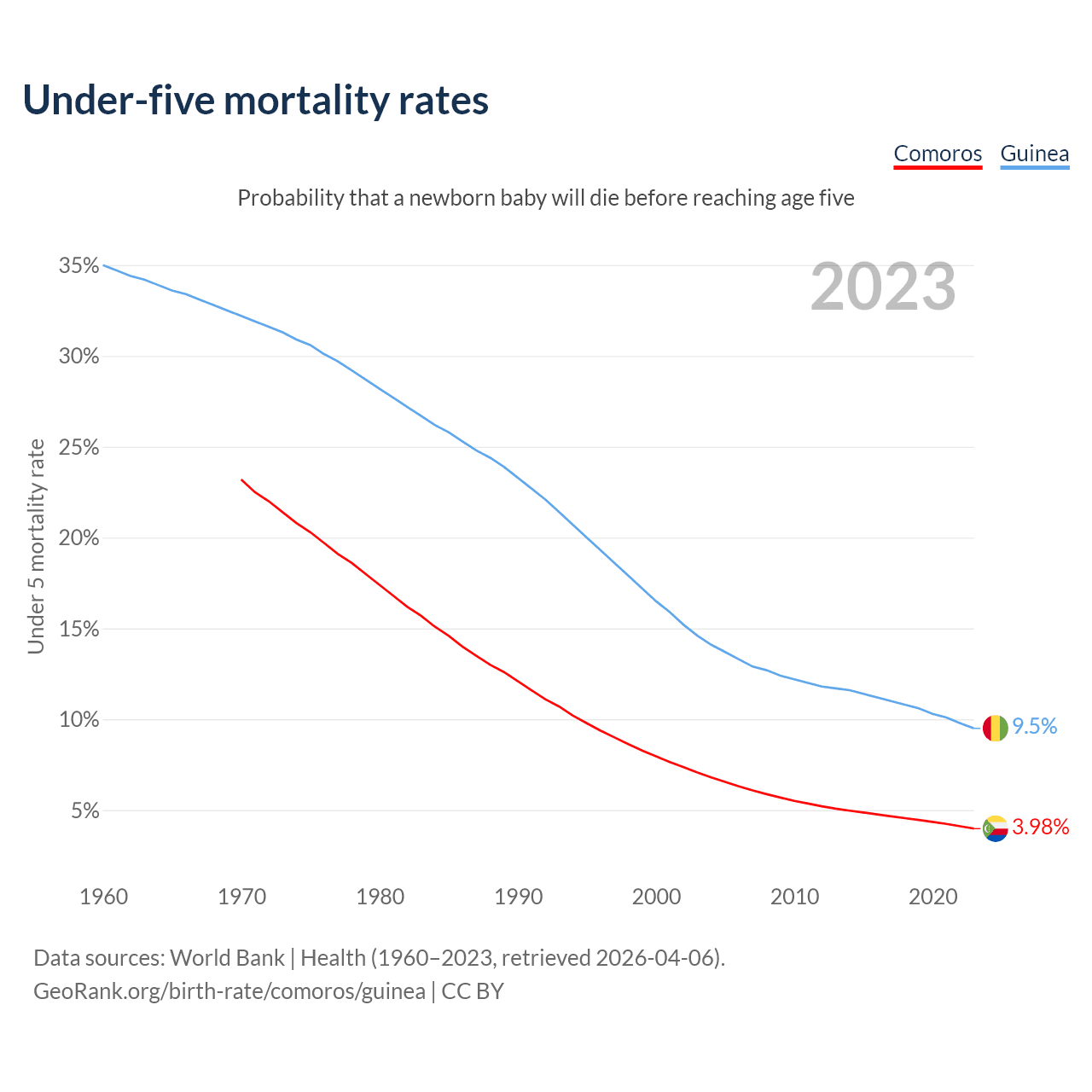 The chance that a newborn baby will die before reaching age five is 3.98% in Comoros and 9.5% in Guinea. Above is a chart with historical data on under-five mortality rates.