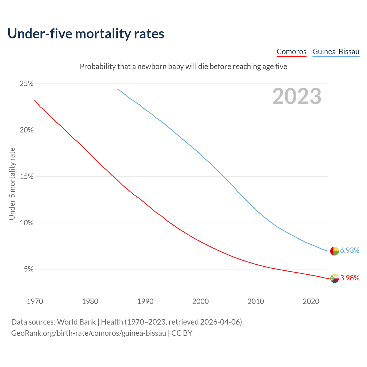 The chance that a newborn baby will die before reaching age five is 3.98% in Comoros and 6.93% in Guinea-Bissau. Above is a chart with historical data on under-five mortality rates.