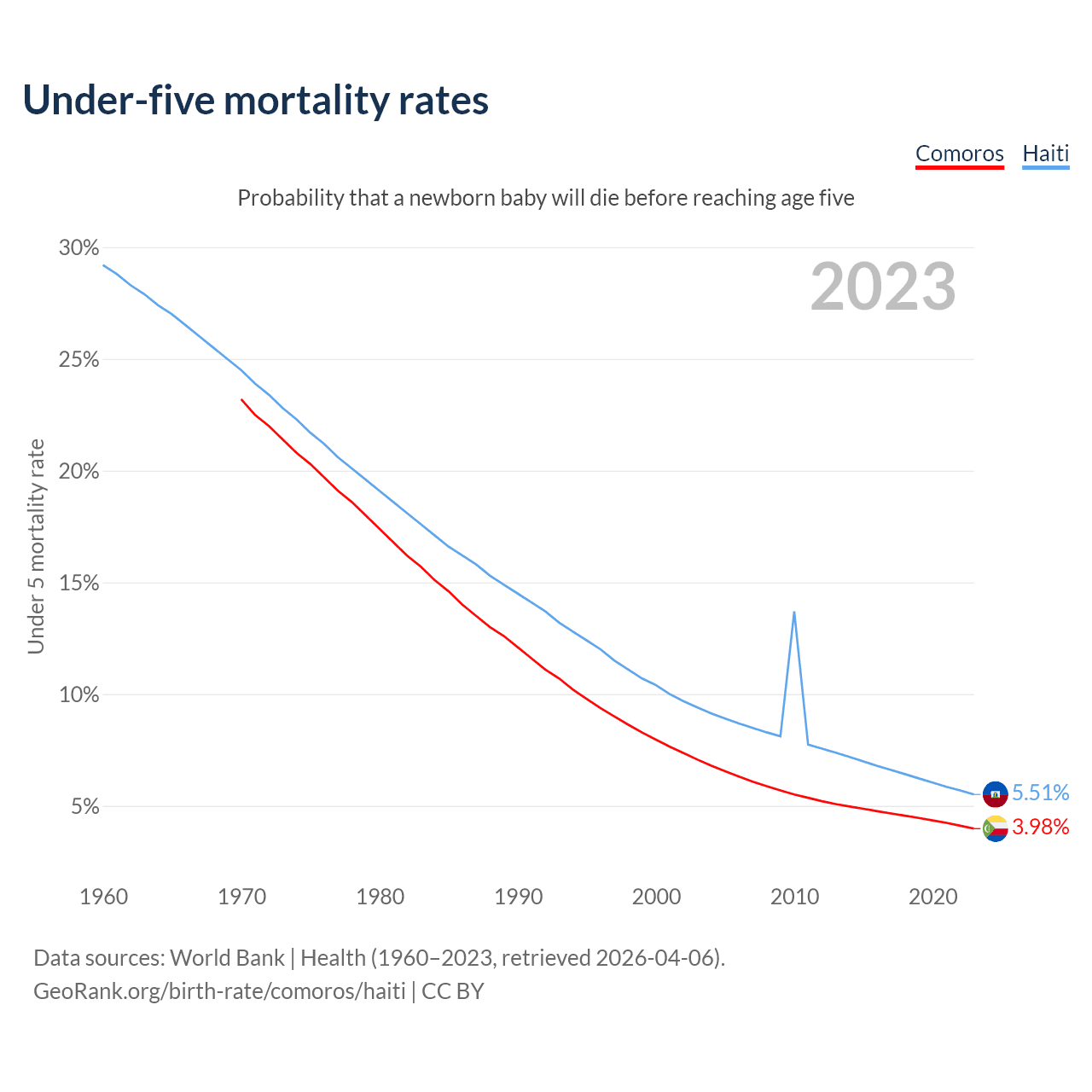 The chance that a newborn baby will die before reaching age five is 3.98% in Comoros and 5.51% in Haiti. Above is a chart with historical data on under-five mortality rates.