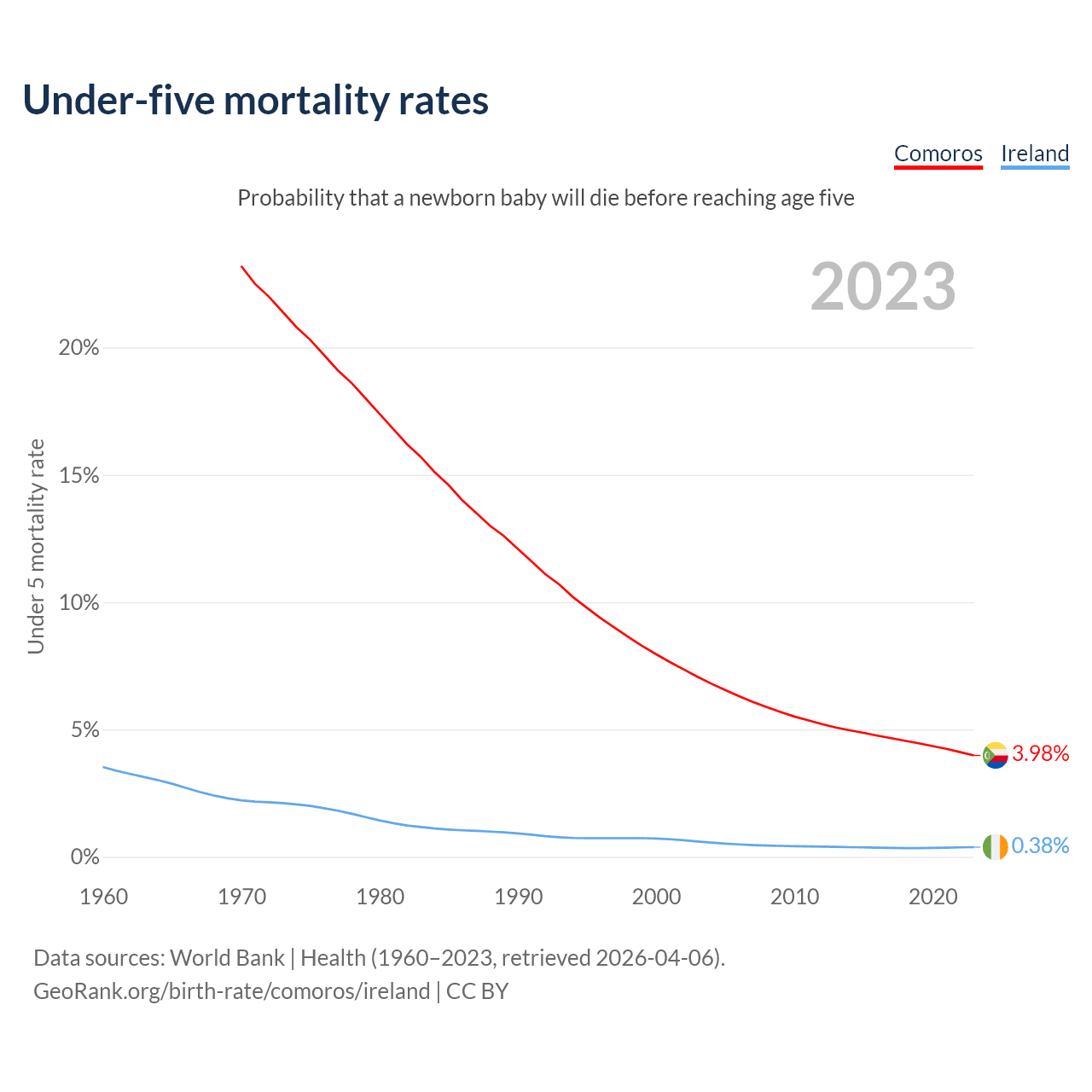 The chance that a newborn baby will die before reaching age five is 3.98% in Comoros and 0.38% in Ireland. Above is a chart with historical data on under-five mortality rates.