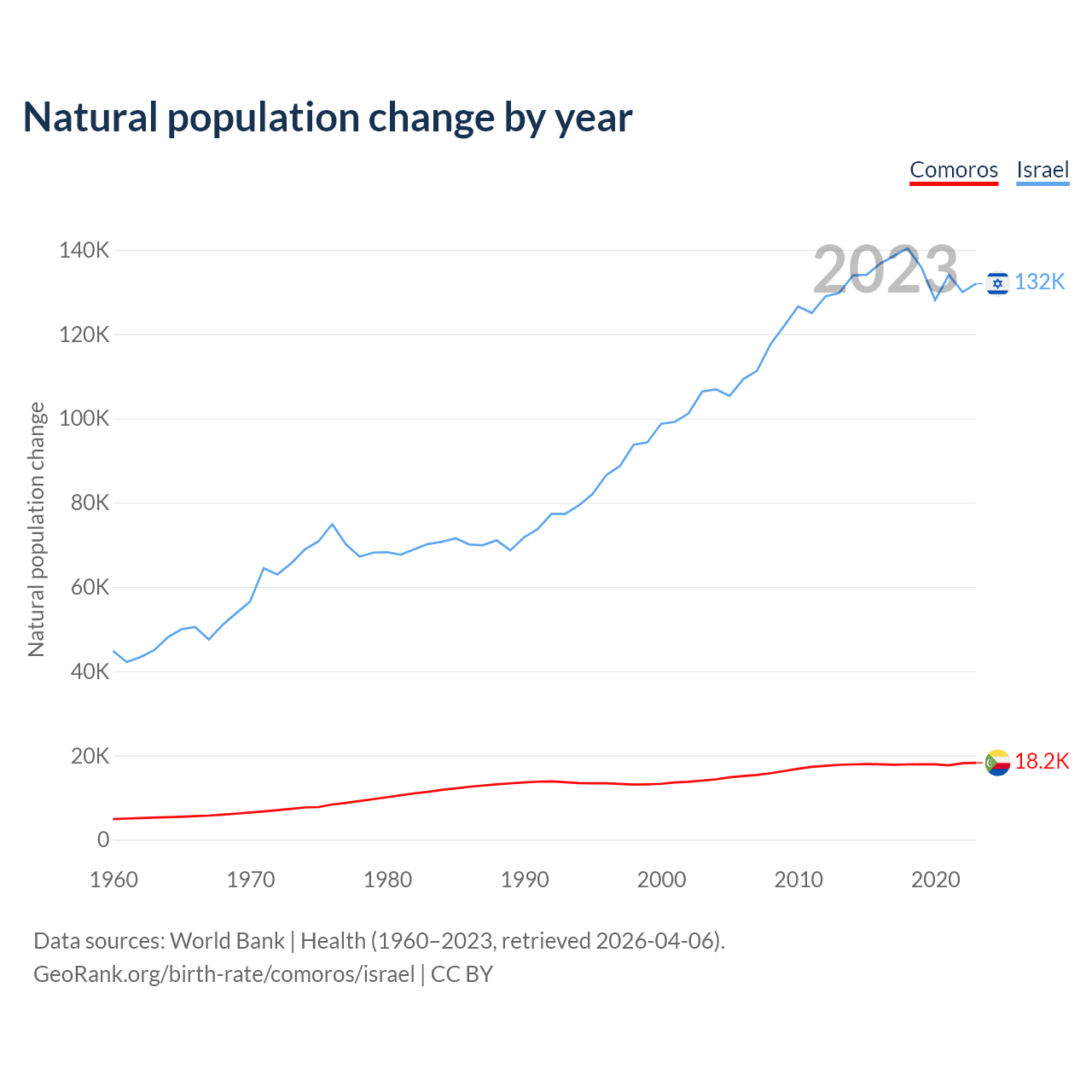 Comoros has an annual birth rate of 28.7 births per 1,000 people, compared to 18.6 for Israel. The average number of children a woman is expected to have during her lifetime — the fertility rate, is 3.88 in Comoros and 2.85 in Israel — 26.5% difference.
