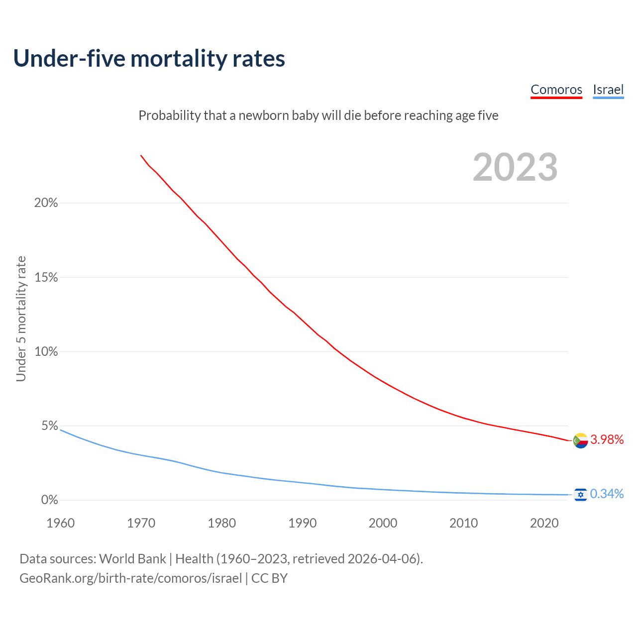The chance that a newborn baby will die before reaching age five is 3.98% in Comoros and 0.34% in Israel. Above is a chart with historical data on under-five mortality rates.