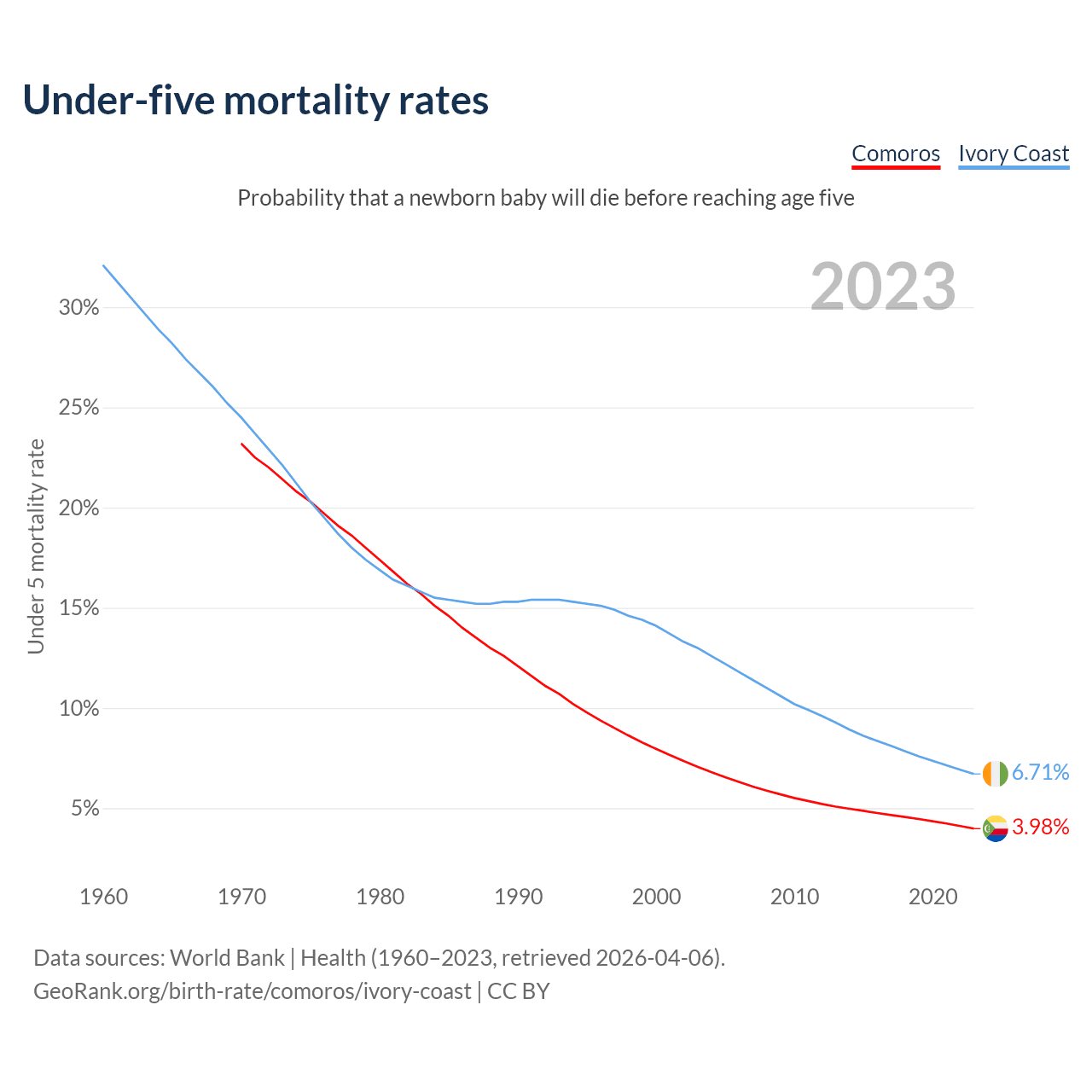 The chance that a newborn baby will die before reaching age five is 3.98% in Comoros and 6.71% in Ivory Coast. Above is a chart with historical data on under-five mortality rates.
