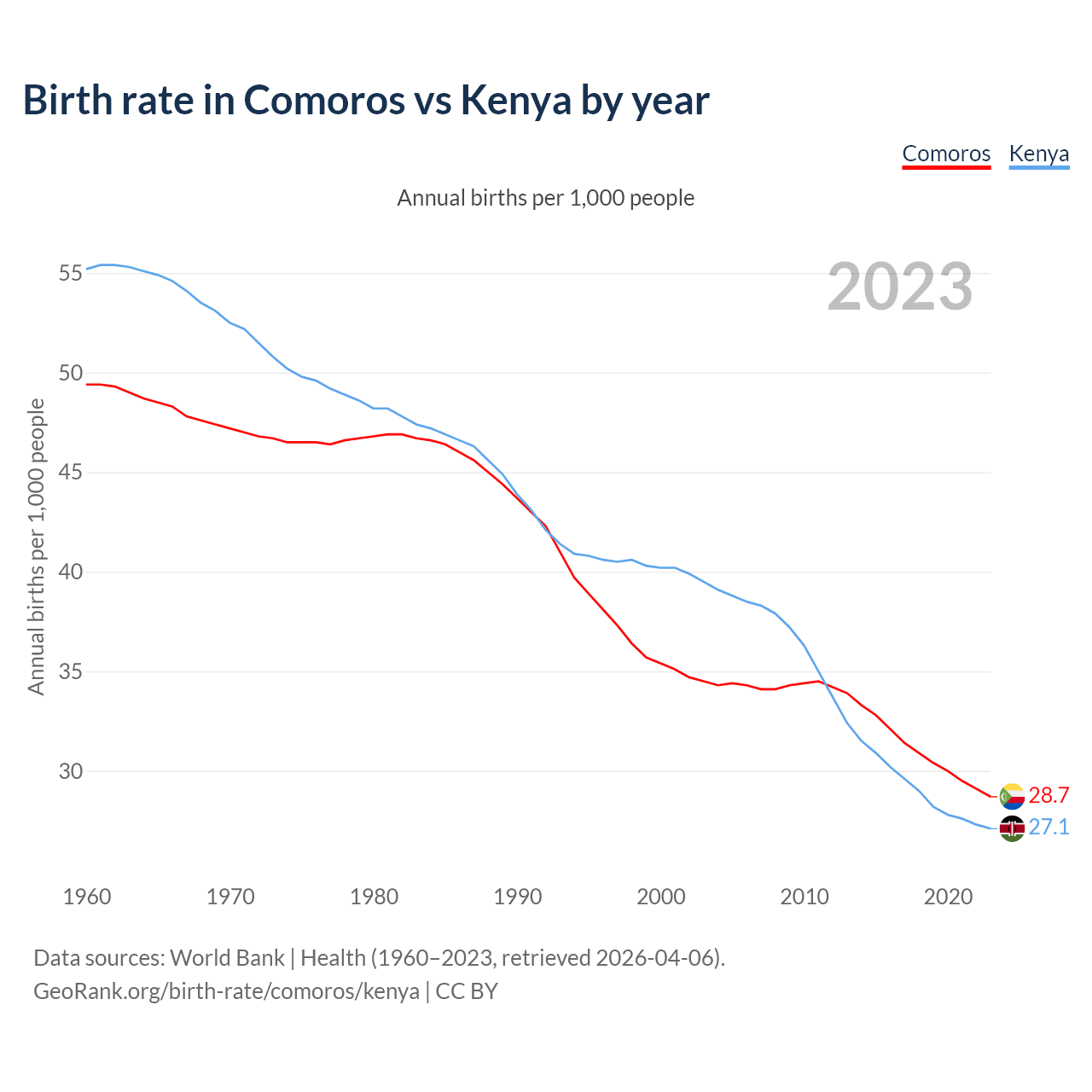 Comoros has an annual birth rate of 28.7 births per 1,000 people, compared to 27.1 for Kenya. The average number of children a woman is expected to have during her lifetime — the fertility rate, is 3.88 in Comoros and 3.21 in Kenya — 17.3% difference.