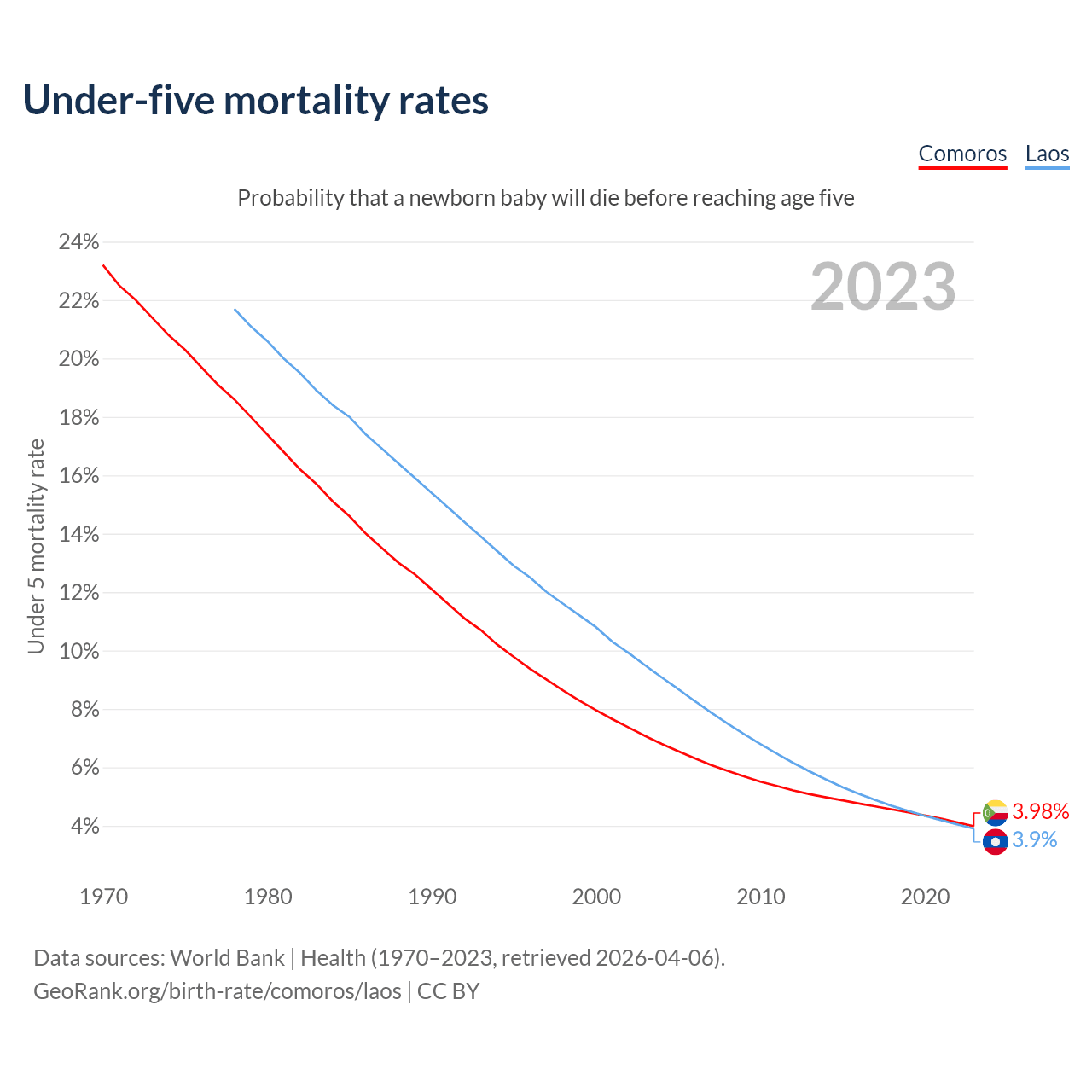 The chance that a newborn baby will die before reaching age five is 3.98% in Comoros and 3.9% in Laos. Above is a chart with historical data on under-five mortality rates.