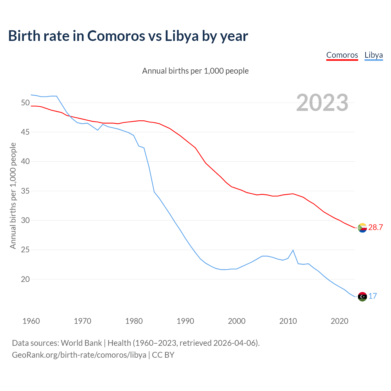 Comoros has an annual birth rate of 28.7 births per 1,000 people, compared to 17 for Libya. The average number of children a woman is expected to have during her lifetime — the fertility rate, is 3.88 in Comoros and 2.36 in Libya — 39.3% difference.
