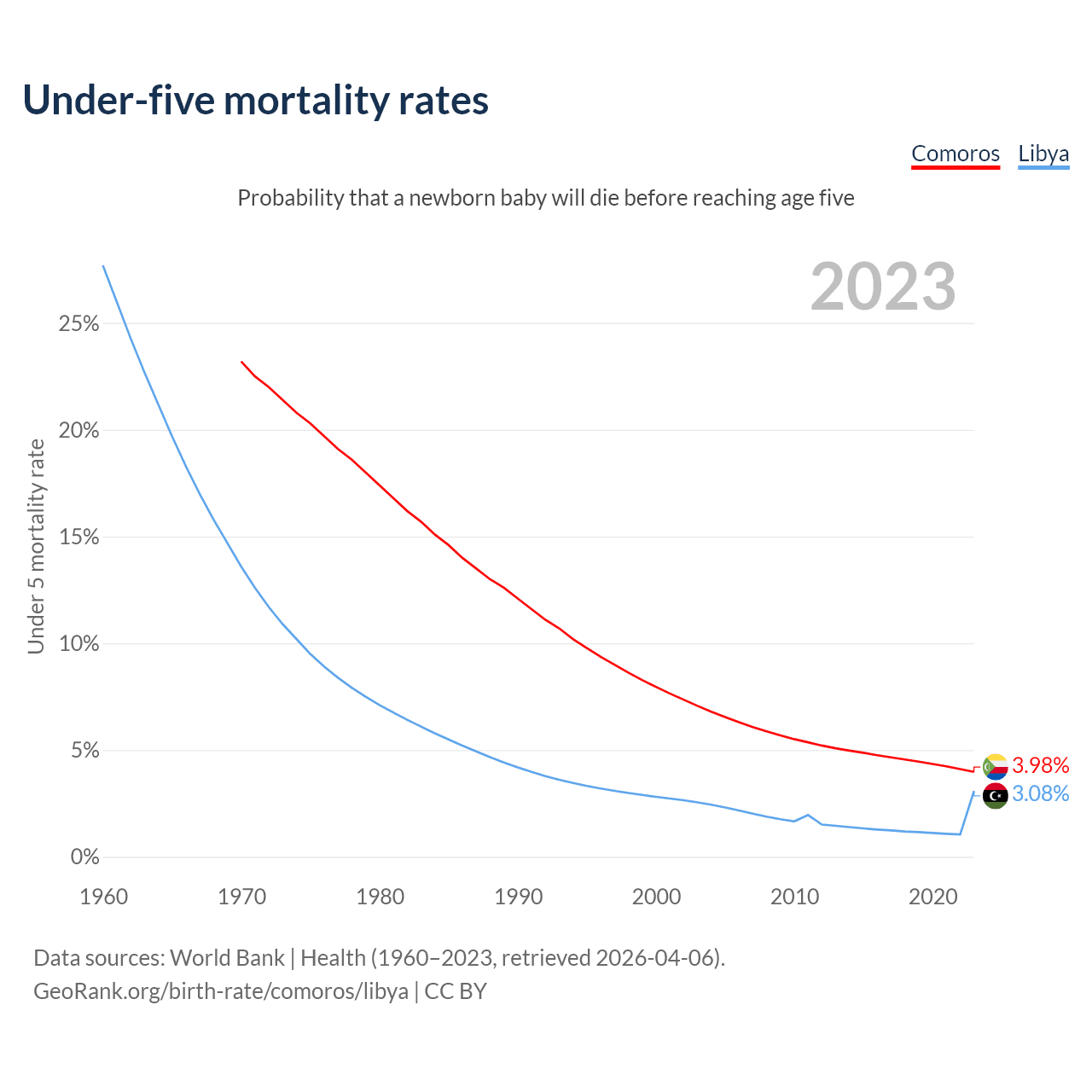 The chance that a newborn baby will die before reaching age five is 3.98% in Comoros and 3.08% in Libya. Above is a chart with historical data on under-five mortality rates.