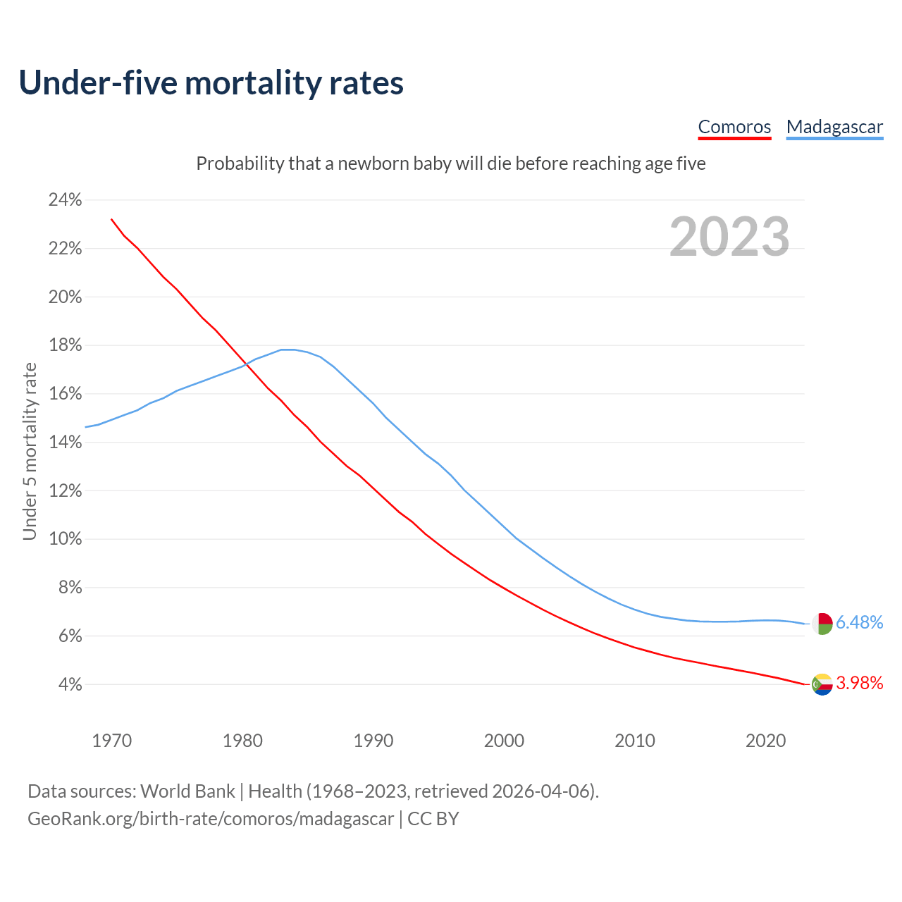 The chance that a newborn baby will die before reaching age five is 3.98% in Comoros and 6.48% in Madagascar. Above is a chart with historical data on under-five mortality rates.