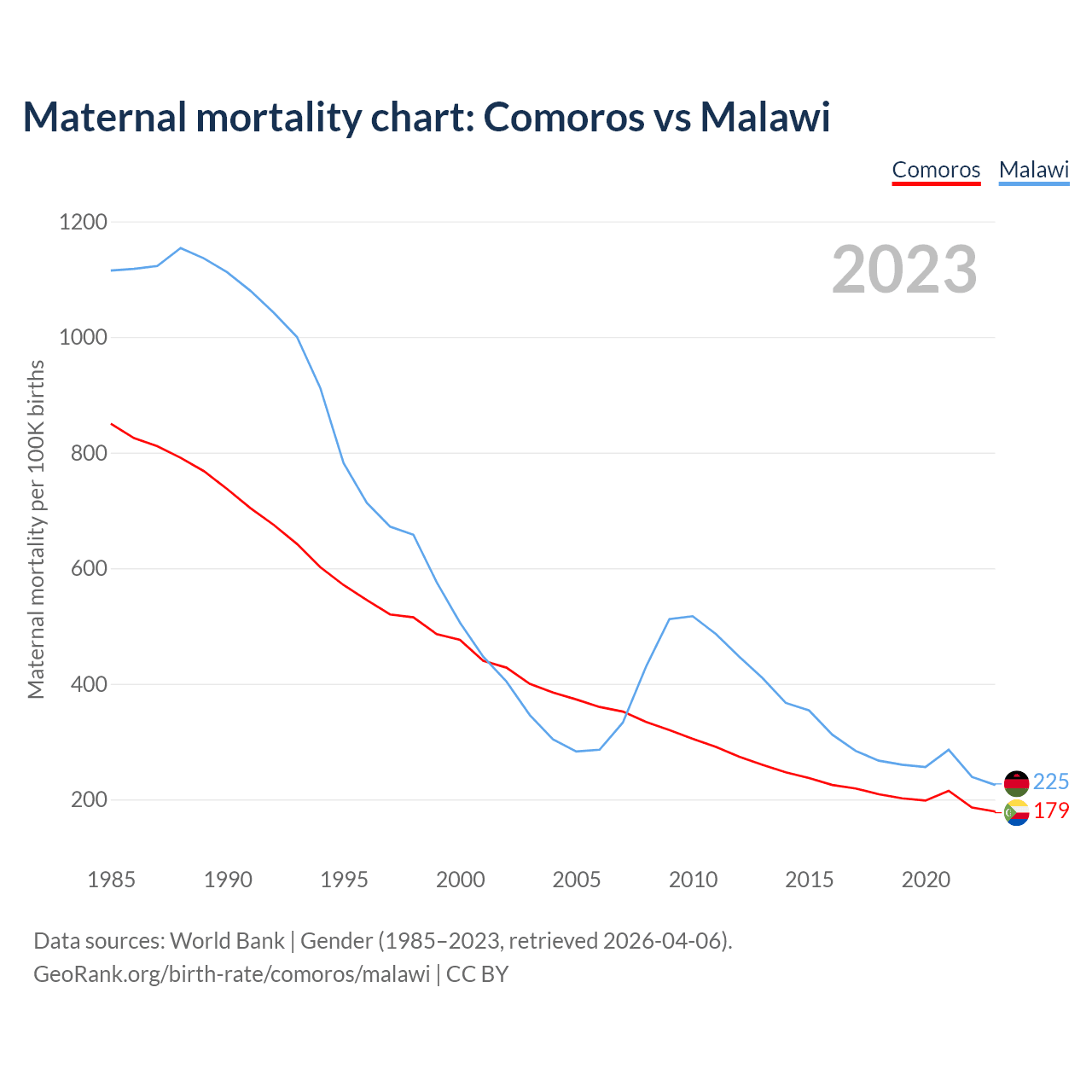 The maternal mortality rate, which is the probability of dying during childbirth or within 42 days of pregnancy termination, is 179 deaths per 100,000 live births in Comoros, compared to 225 deaths in Malawi.