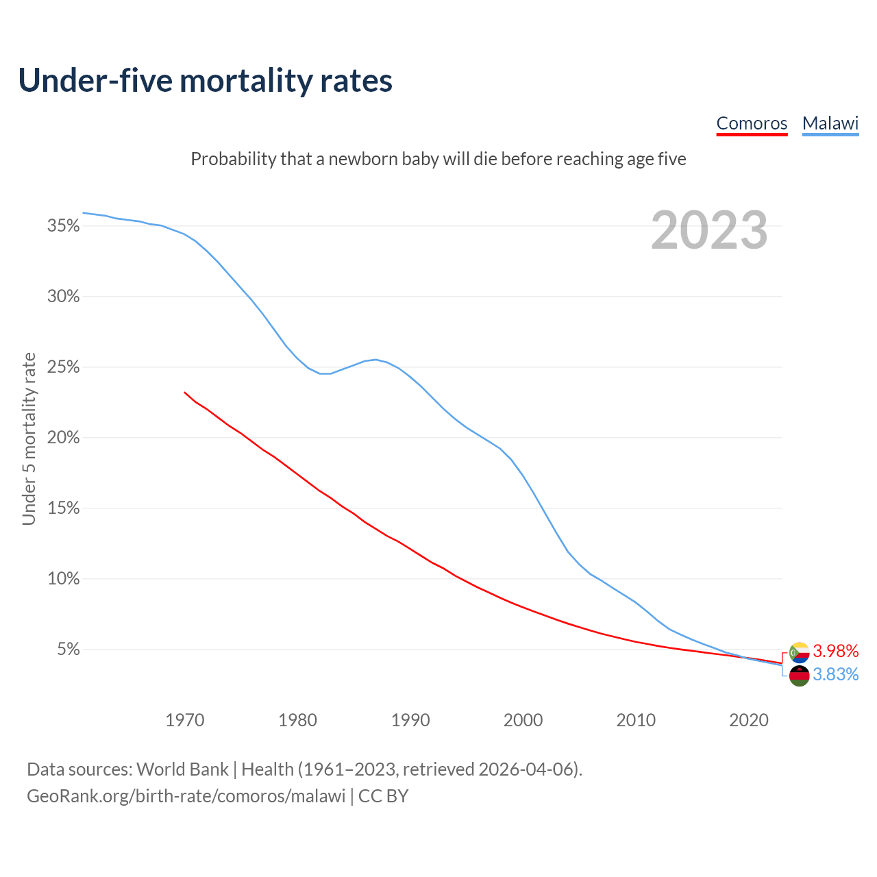 The chance that a newborn baby will die before reaching age five is 3.98% in Comoros and 3.83% in Malawi. Above is a chart with historical data on under-five mortality rates.