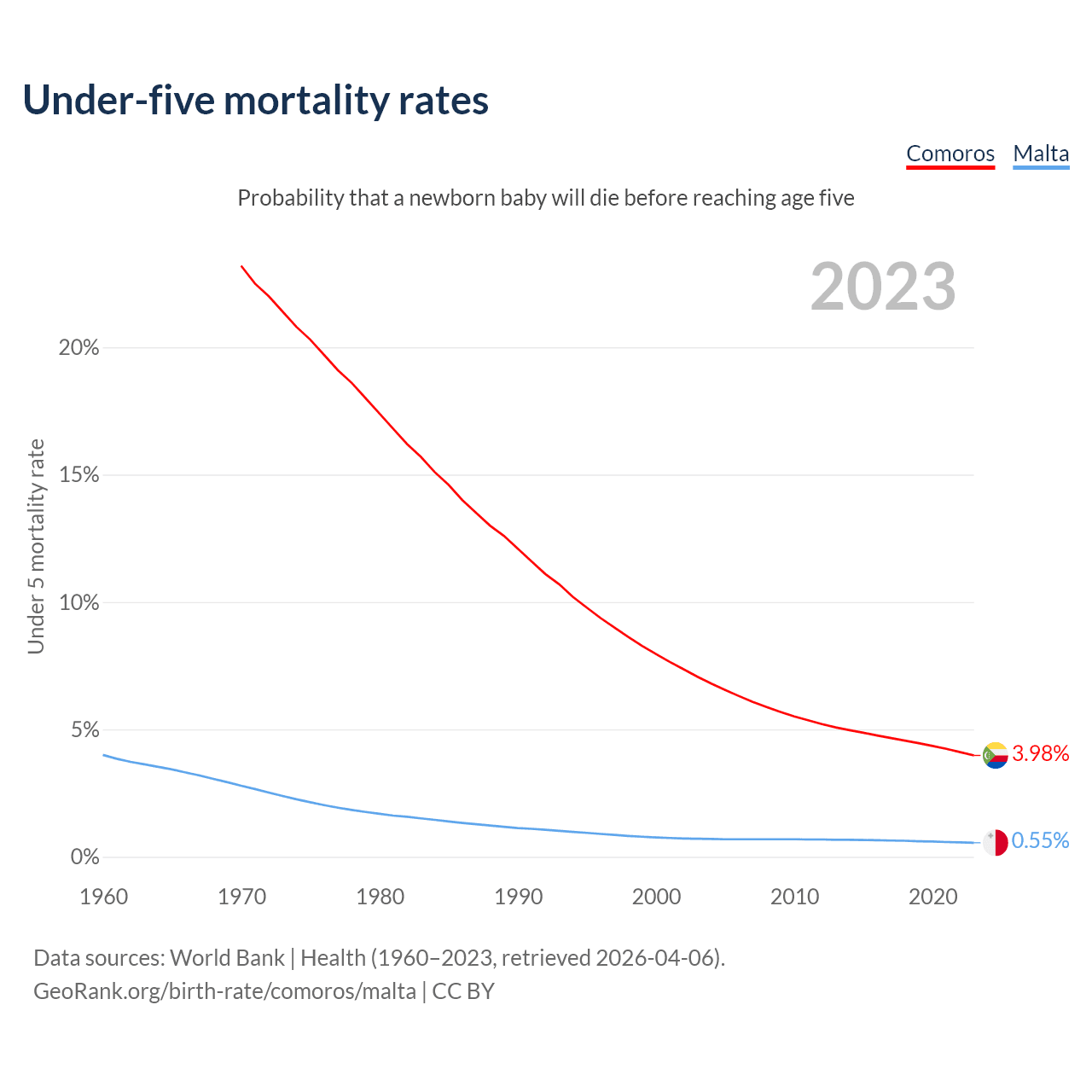 The chance that a newborn baby will die before reaching age five is 3.98% in Comoros and 0.55% in Malta. Above is a chart with historical data on under-five mortality rates.