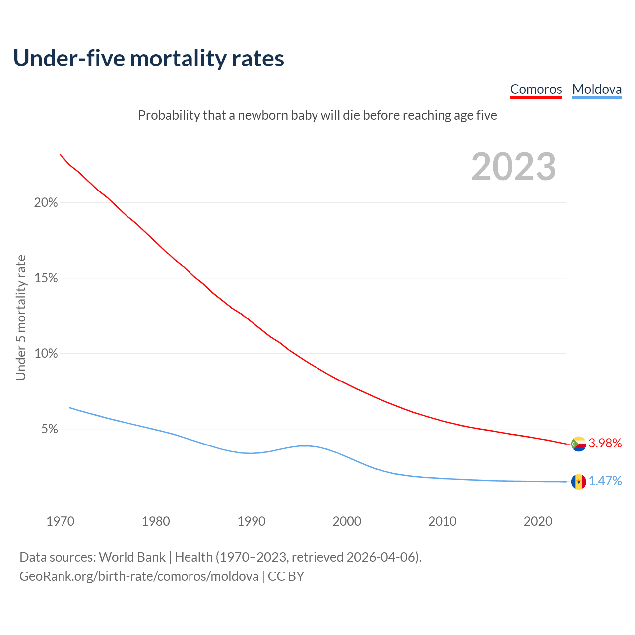 The chance that a newborn baby will die before reaching age five is 3.98% in Comoros and 1.47% in Moldova. Above is a chart with historical data on under-five mortality rates.