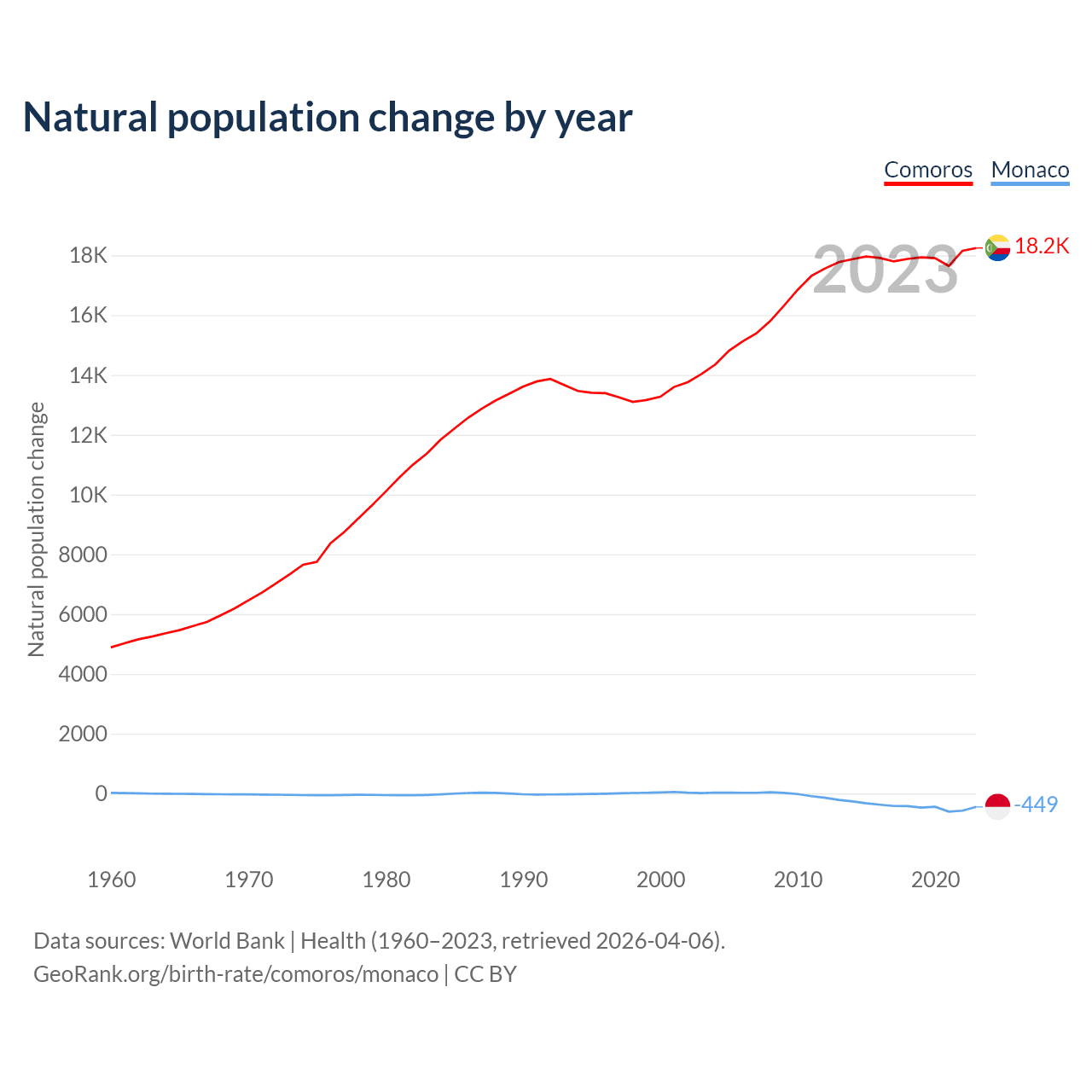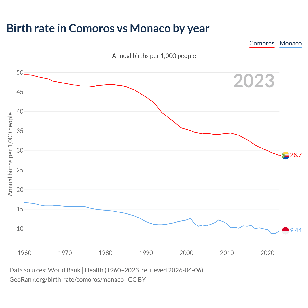 Comoros has an annual birth rate of 28.7 births per 1,000 people, compared to 9.44 for Monaco. The average number of children a woman is expected to have during her lifetime — the fertility rate, is 3.88 in Comoros and 2.11 in Monaco — 45.6% difference.