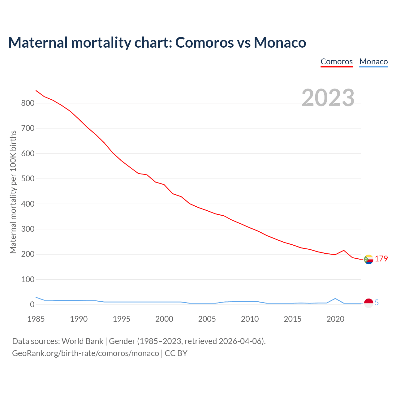 The maternal mortality rate, which is the probability of dying during childbirth or within 42 days of pregnancy termination, is 179 deaths per 100,000 live births in Comoros, compared to 5 deaths in Monaco.