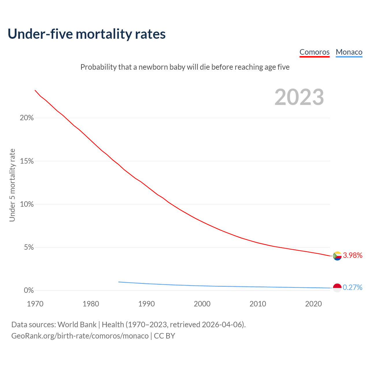 The chance that a newborn baby will die before reaching age five is 3.98% in Comoros and 0.27% in Monaco. Above is a chart with historical data on under-five mortality rates.