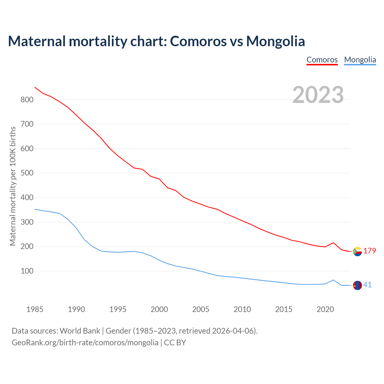 The maternal mortality rate, which is the probability of dying during childbirth or within 42 days of pregnancy termination, is 179 deaths per 100,000 live births in Comoros, compared to 41 deaths in Mongolia.