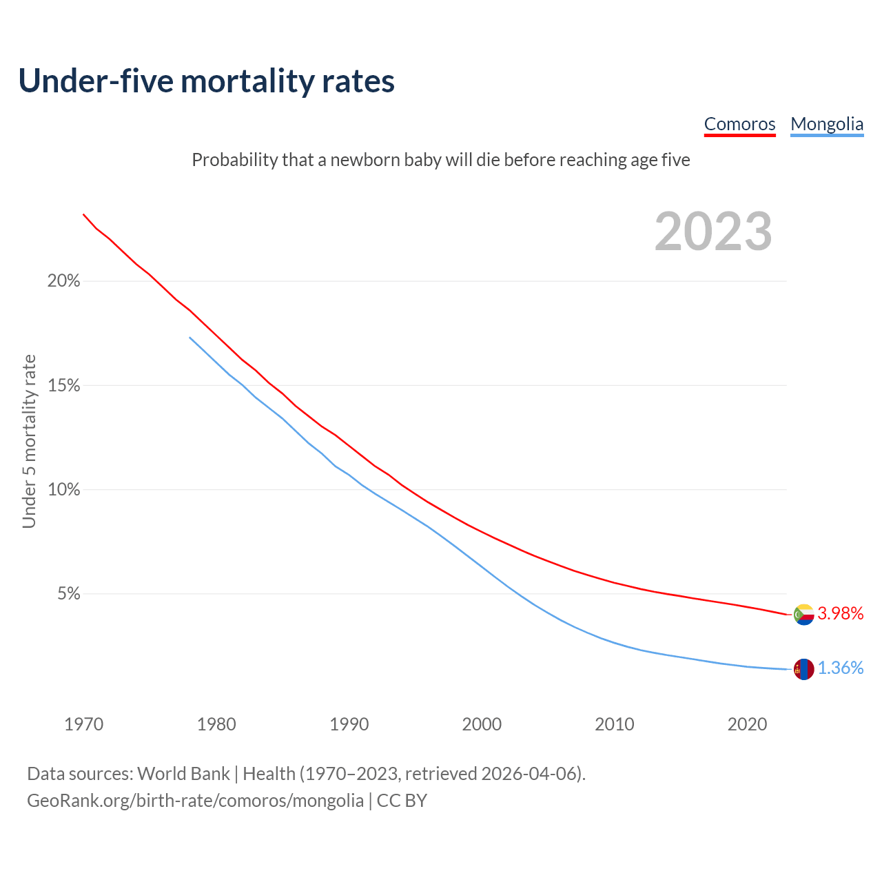 The chance that a newborn baby will die before reaching age five is 3.98% in Comoros and 1.36% in Mongolia. Above is a chart with historical data on under-five mortality rates.